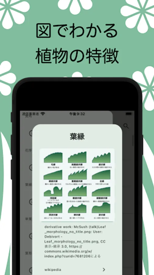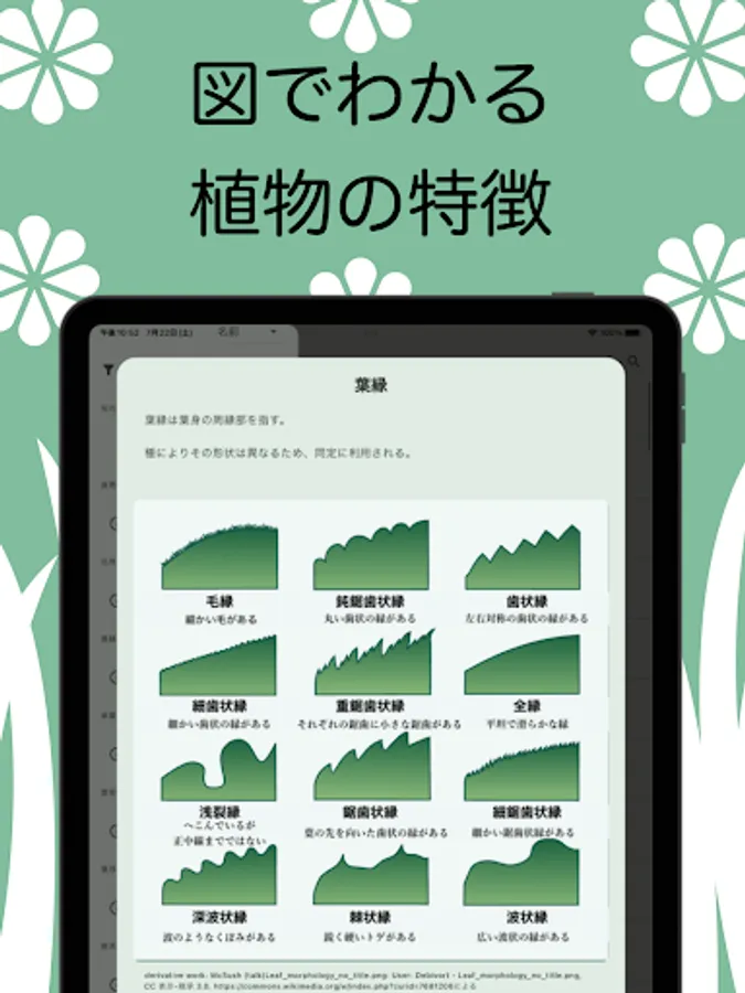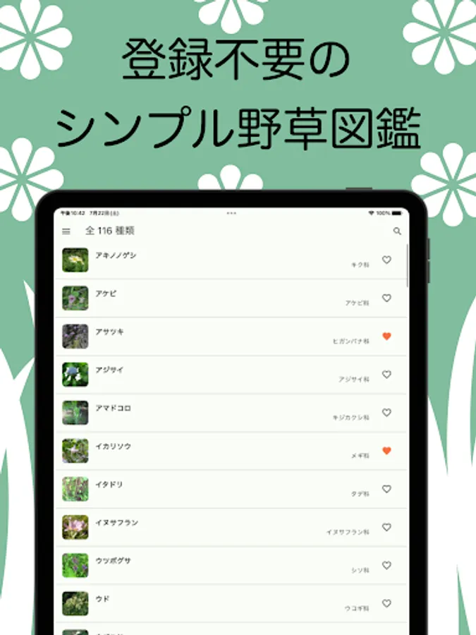 You can see a total of 21 items such as "name", "inflorescence", "phyllotaxis", "single-leaf compound leaf type", "leaf shape", "leaf edge", "vein system", and "similar wild grass" of about 120 kinds of wild grass.