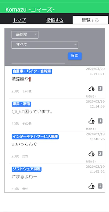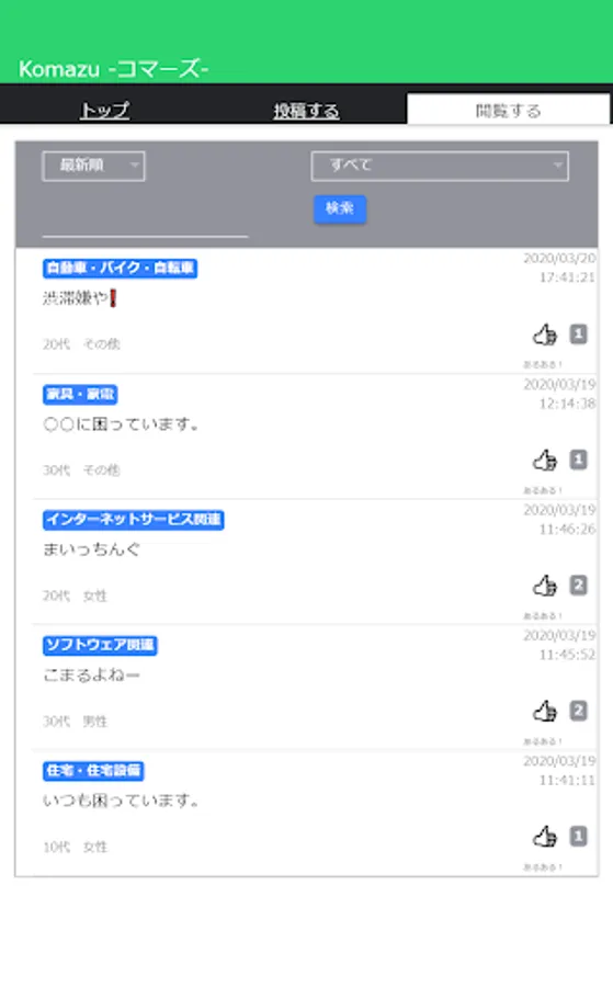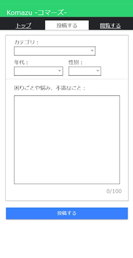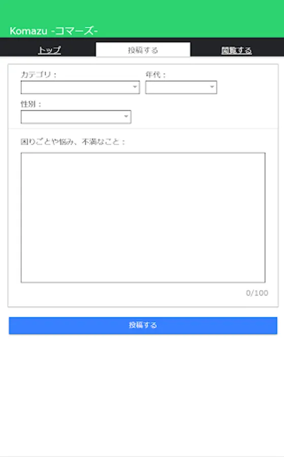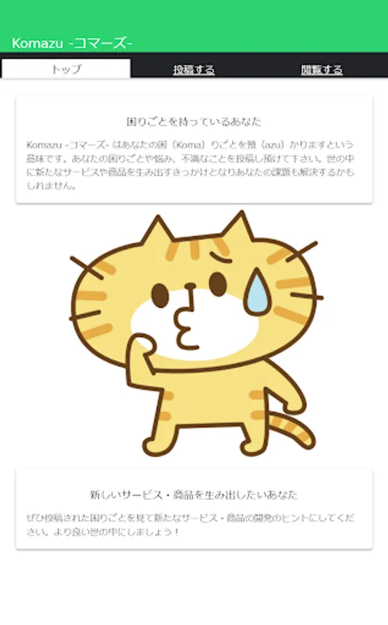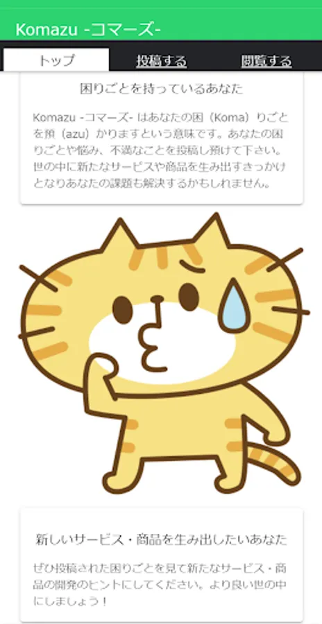 Komazu-Commerce-means to azu your koma. It is an application that can anonymously post any troubles, worries, or dissatisfactions around you. Your posts may trigger new services and products in the world, and may even solve your issues. You who have some trouble, trouble, or dissatisfaction! Please install the app and post your troubles.