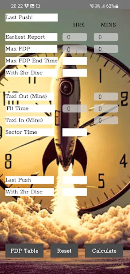 Getting delayed? ATC on strike again? Helps you work out the last time to push taking into account your expected flight, taxi times and available FDP.