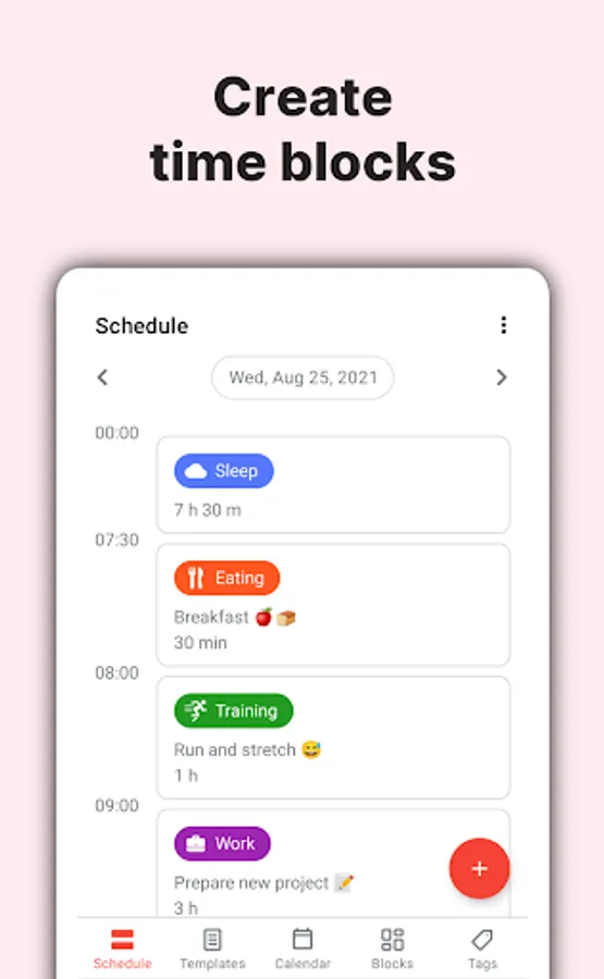 TimeTune uses time blocks to build your schedule. Just add time blocks to your day or use time blocks to build templates that can be reused at any time, like a morning routine, a full day template or a timetable.