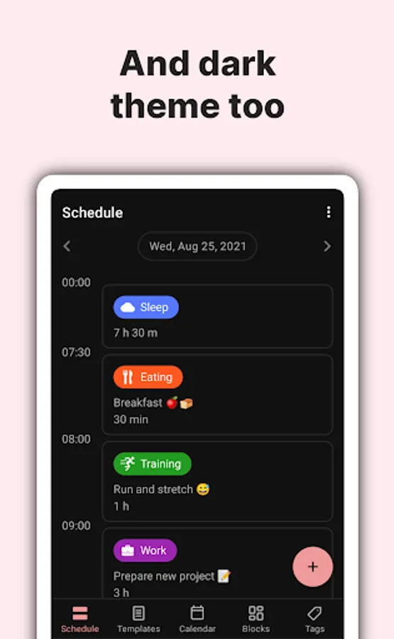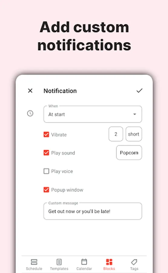Also, you can add custom reminders to your time blocks, so you don’t forget about your agenda: reminders with custom vibrations, reminders with custom sounds, voice reminders, etc.