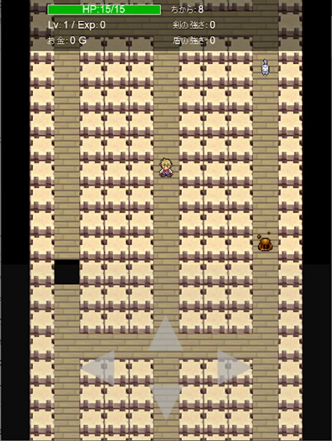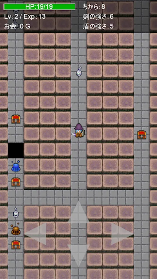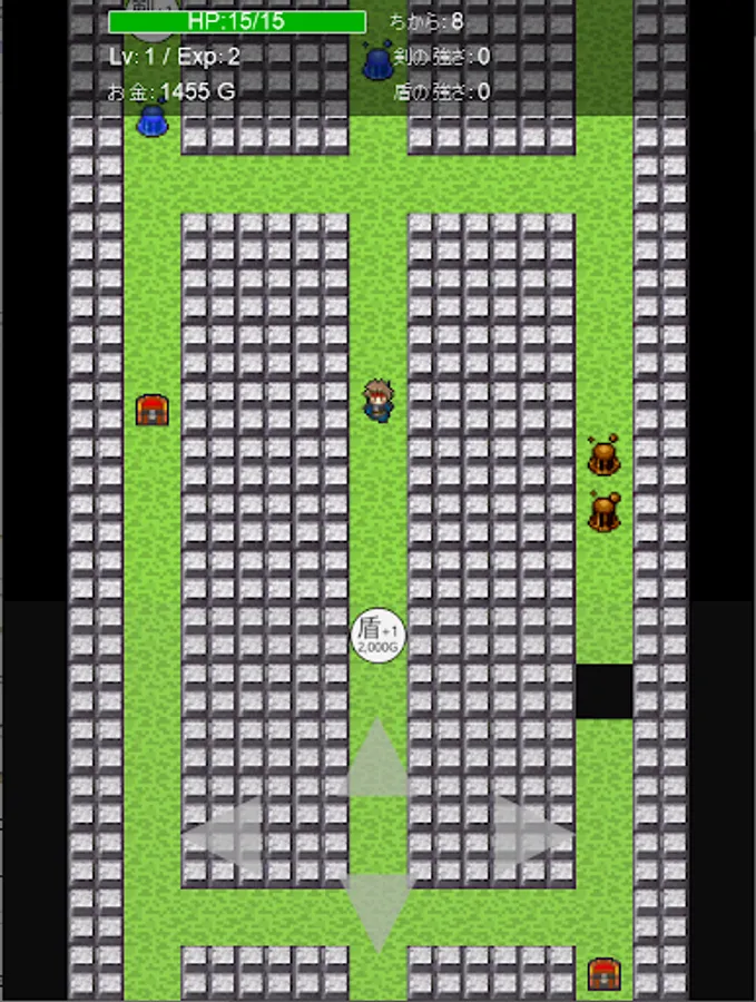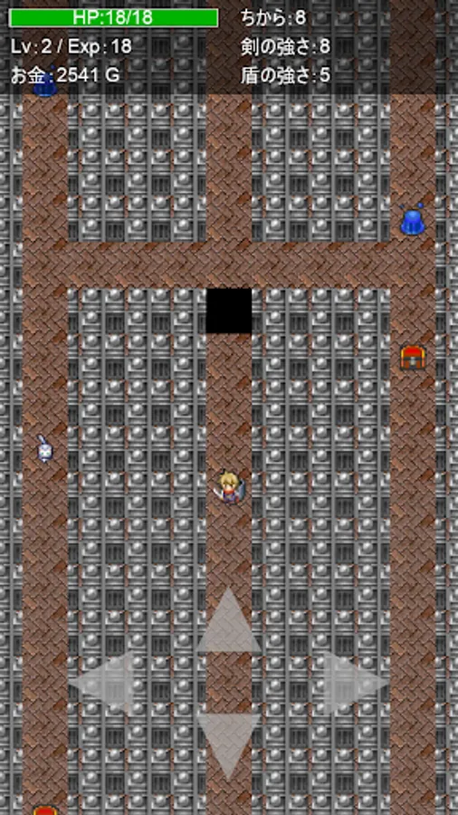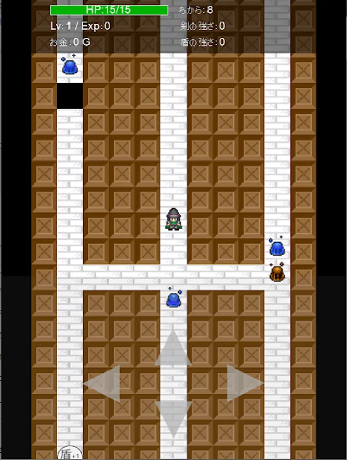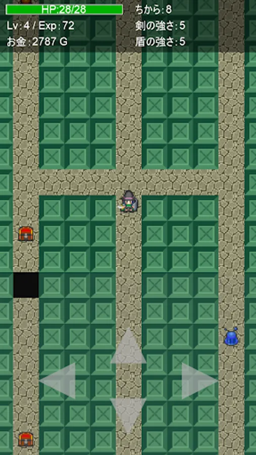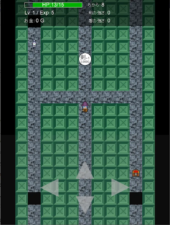 Get a sword or shield from a treasure box that is randomly generated and forcedly scrolled every time you play, strengthen the swords, defeat the monsters, and have a roguelike element. Easy to operate. Just move the player up / down / left / right. The battle is automatic when it is adjacent to a monster. The game is over when the player becomes invisible due to forced scrolling, or when HP becomes 0 in a battle with a monster. Because of the forced scrolling, there is no time to think carefully like a normal roguelike, you have to rush through the dungeon. The dungeon is divided into more than 50 areas, and the monsters become stronger as you move forward. Aim to reach more than 50 areas.
