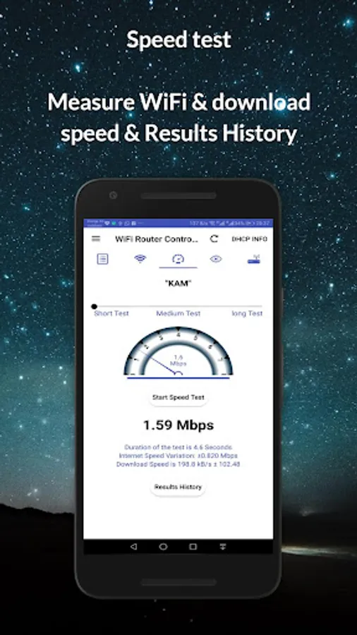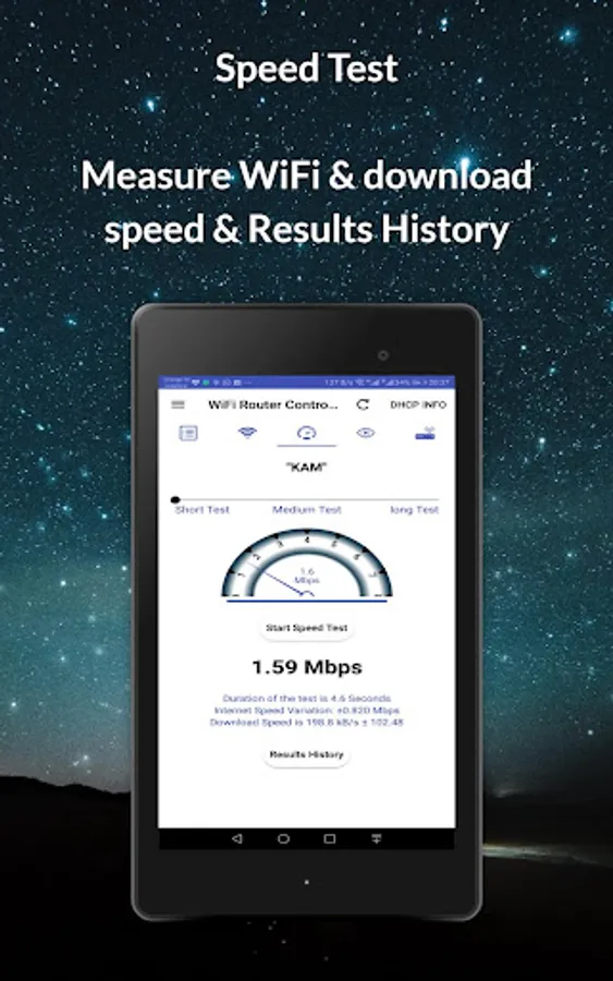 3- ***Router Speed Test (Internet meter):*** The application contains a router speed test mechanism for your WiFi router, it will calculate the actual Internet Speed, which is the real received internet (broadband Speed) plus download speed, and supports three speed tests length, also you can revise your internet speed test history.