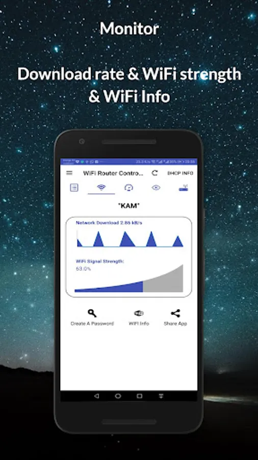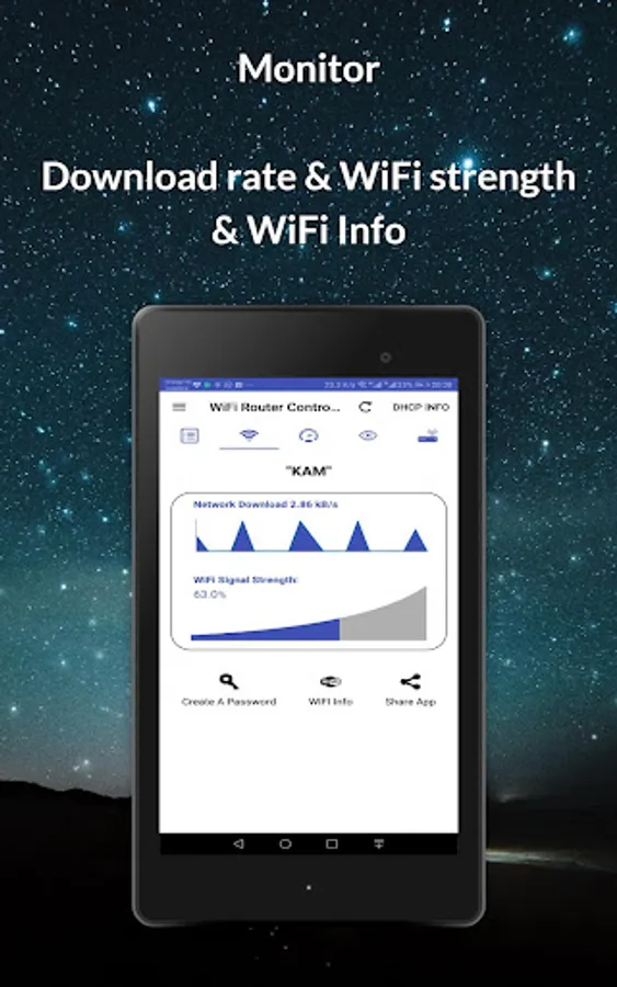 5- *** WiFi Information:*** Router Admin Setup Control contains the tools that will let you know the following information: traffic rate (download rate), WiFi signal strength, network IP, MAC address, DNS and DHCP info of any router.