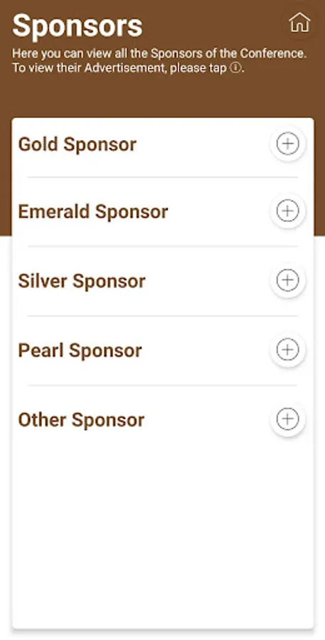 • Sponsors - This feature enables you to view all the Sponsors of the Conference, categorized into 5 categories : Platinum, Gold, Emerald, Silver, Pearl, and Other. You also have the ability to view their respective Advertisements.