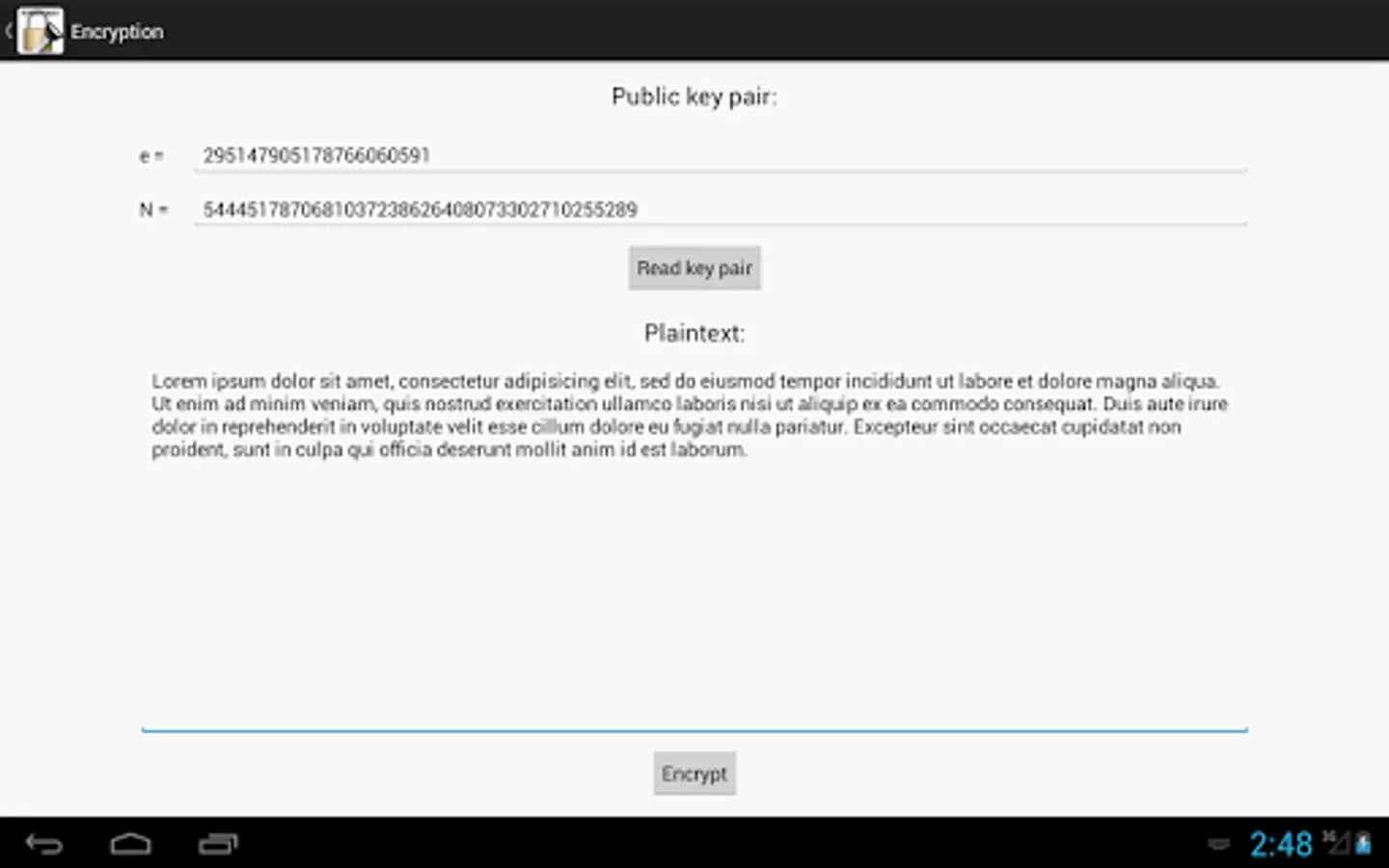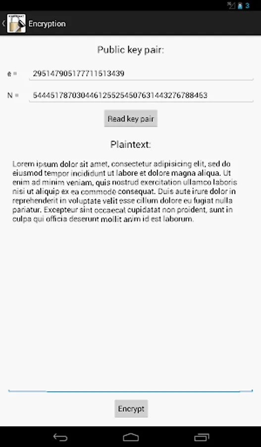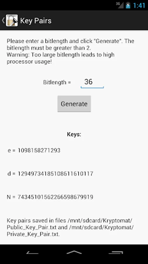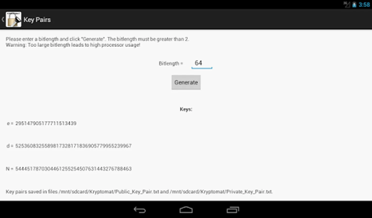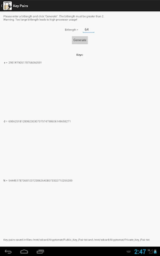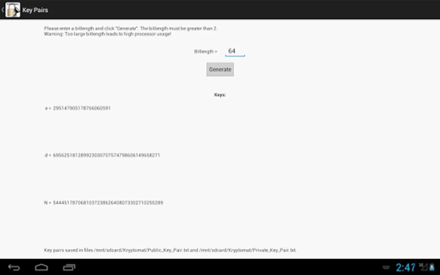 With Kryptomat texts of any length can be encrypted using the RSA method. The strength of the encryption can here be specified during encryption using the bitlength (military standard are 1024 bits) of the primes to be generated. The bitlength is, however, dependent on the available heap memory in Android. Due to this restriction key pairs could be produced with a maximum bitlength of 1023 with the devices tested so far.