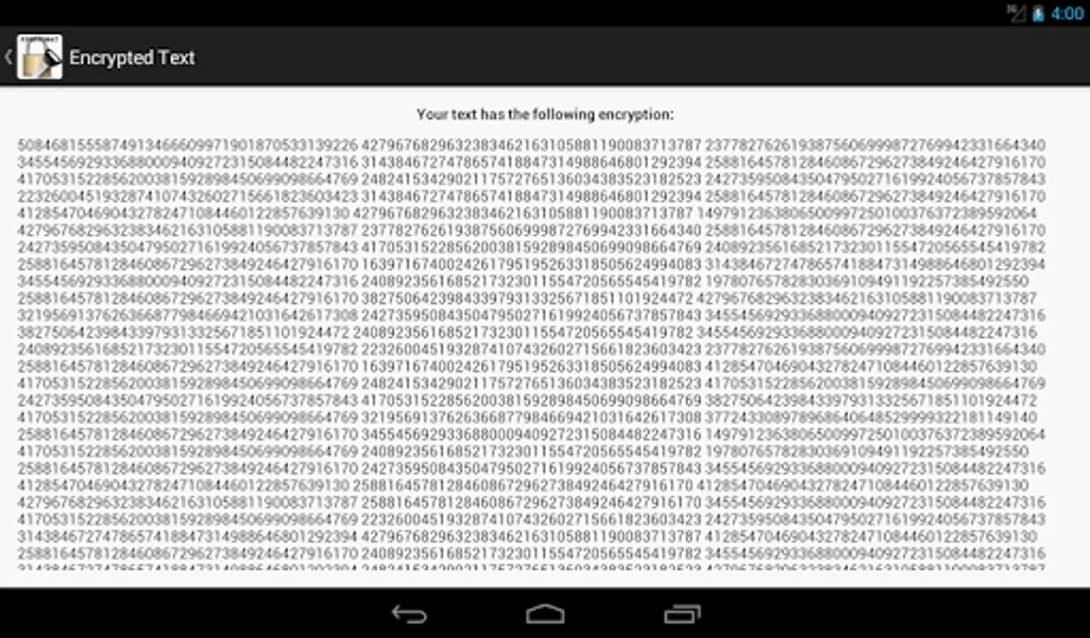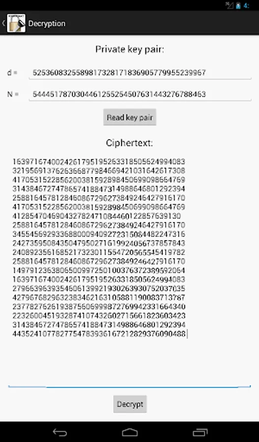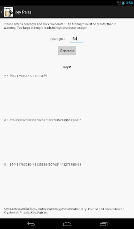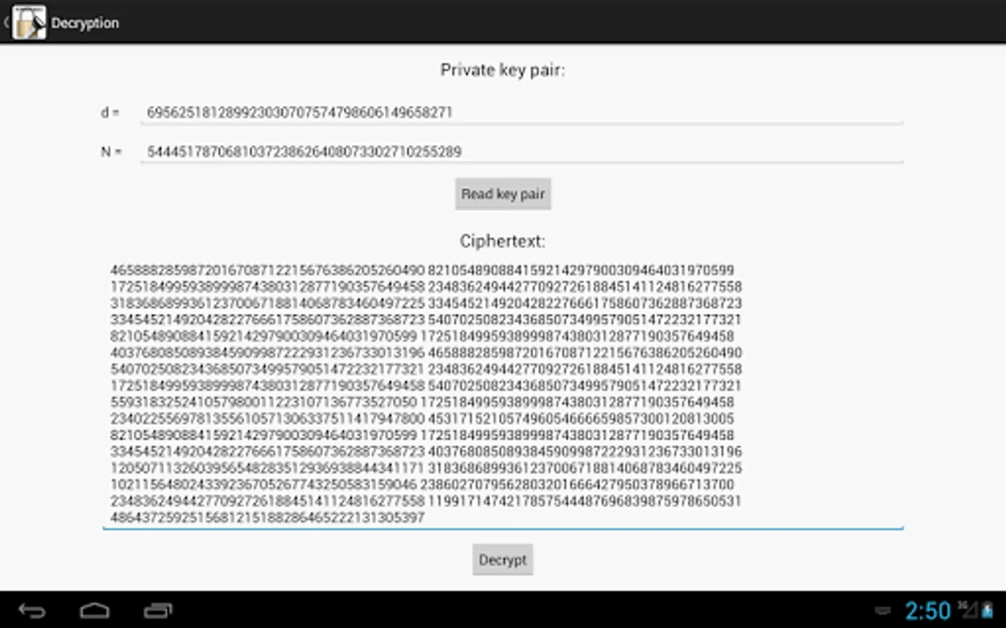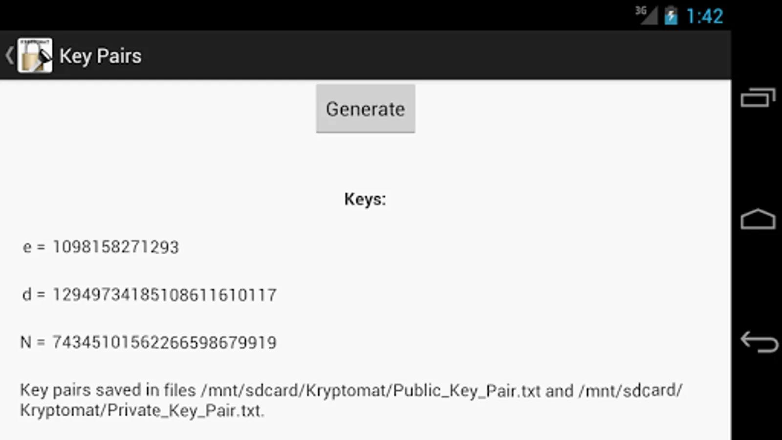 With Kryptomat texts of any length can be encrypted using the RSA method. The strength of the encryption can here be specified during encryption using the bitlength (military standard are 1024 bits) of the primes to be generated. The bitlength is, however, dependent on the available heap memory in Android. Due to this restriction key pairs could be produced with a maximum bitlength of 1023 with the devices tested so far.
