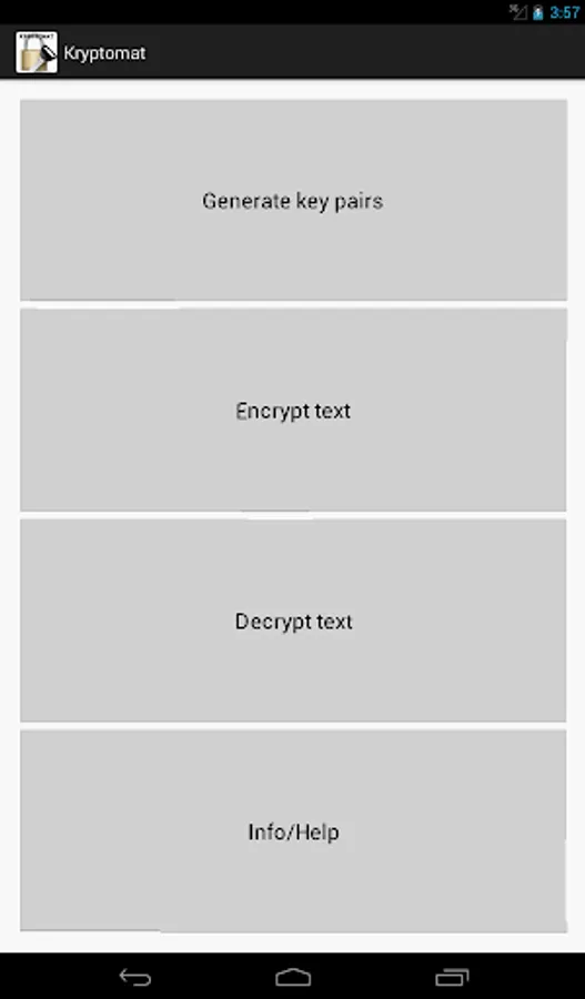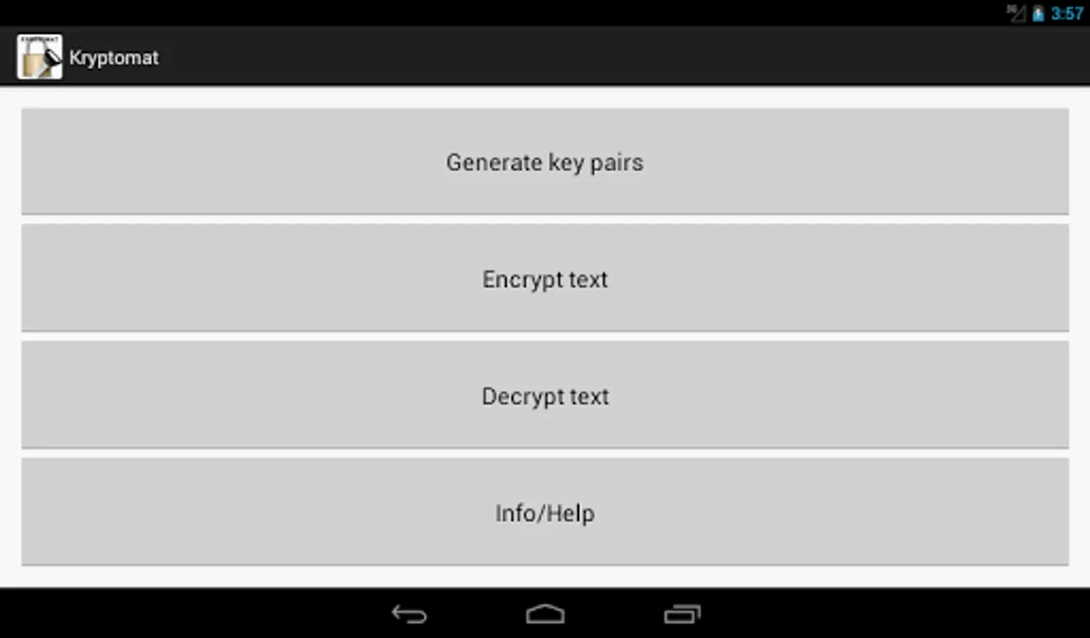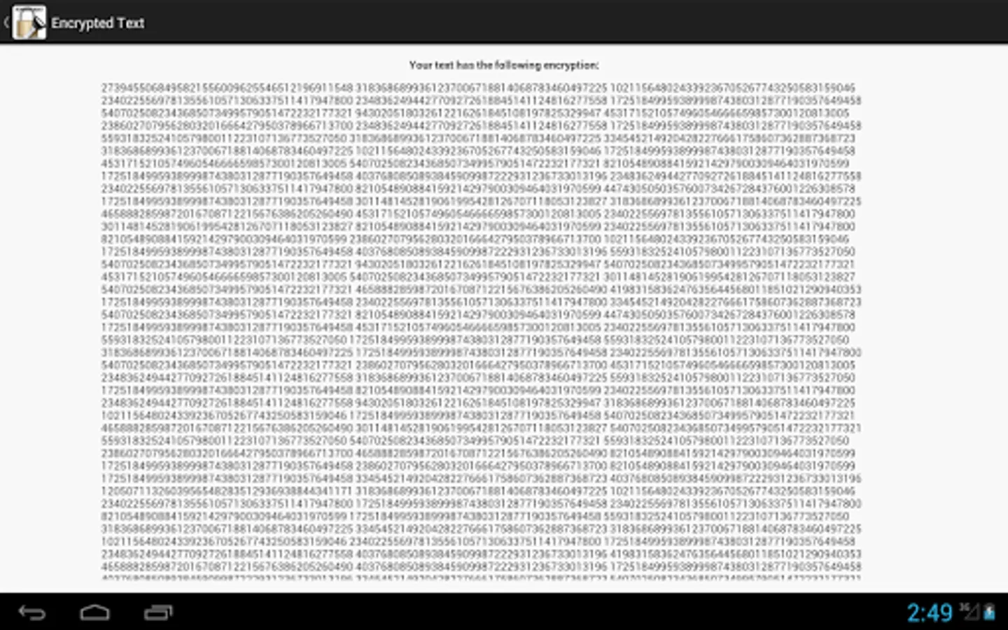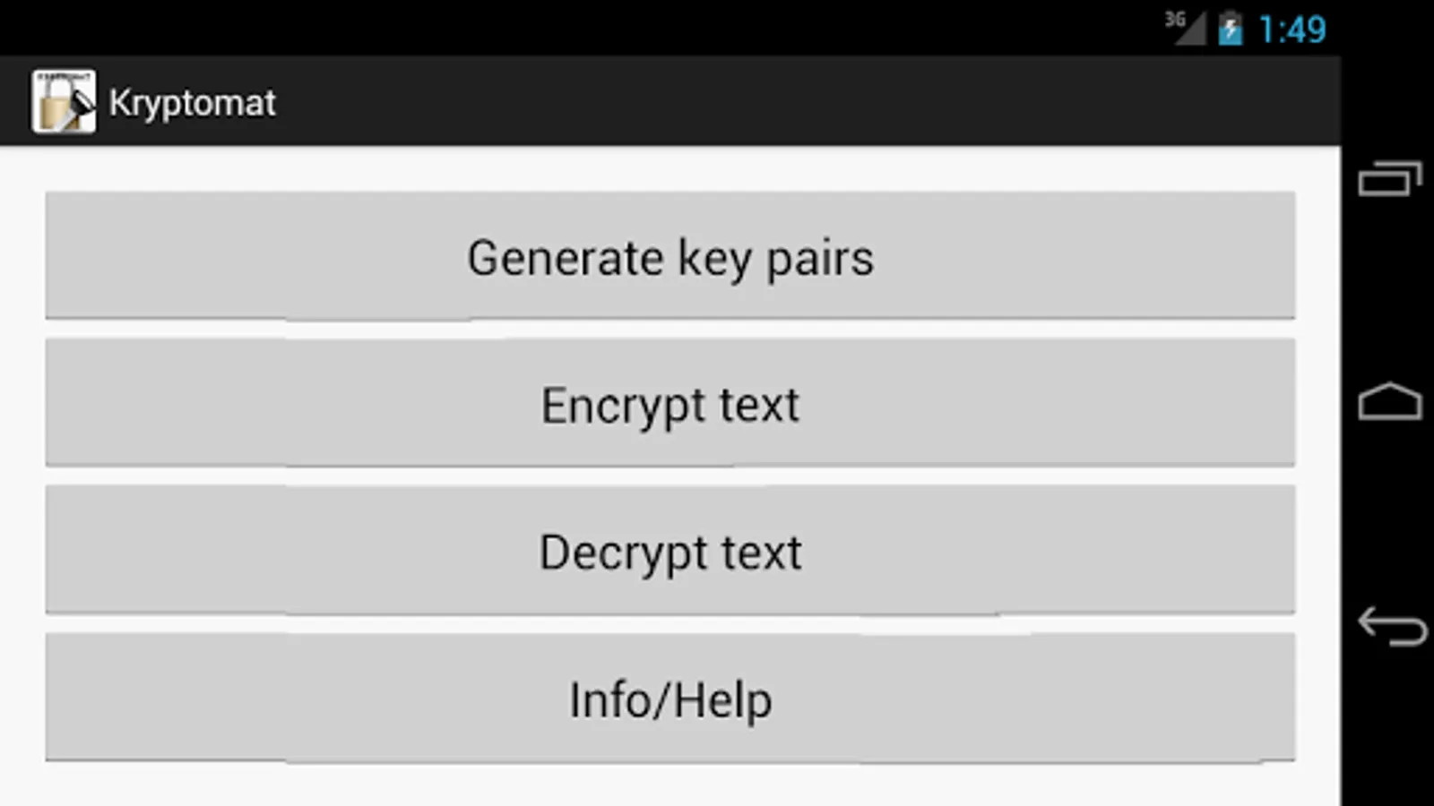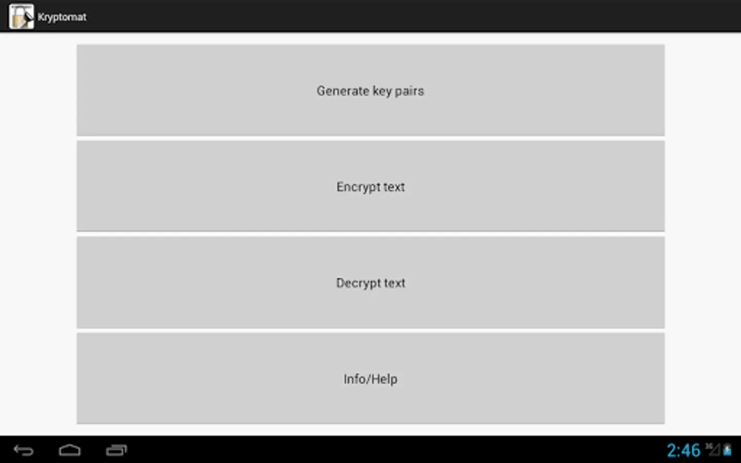 With Kryptomat texts of any length can be encrypted using the RSA method. The strength of the encryption can here be specified during encryption using the bitlength (military standard are 1024 bits) of the primes to be generated. The bitlength is, however, dependent on the available heap memory in Android. Due to this restriction key pairs could be produced with a maximum bitlength of 1023 with the devices tested so far.