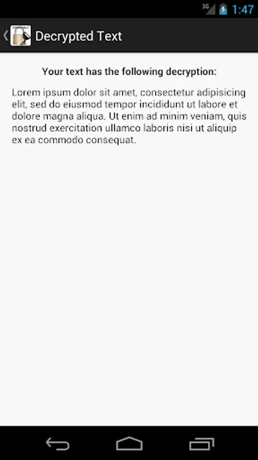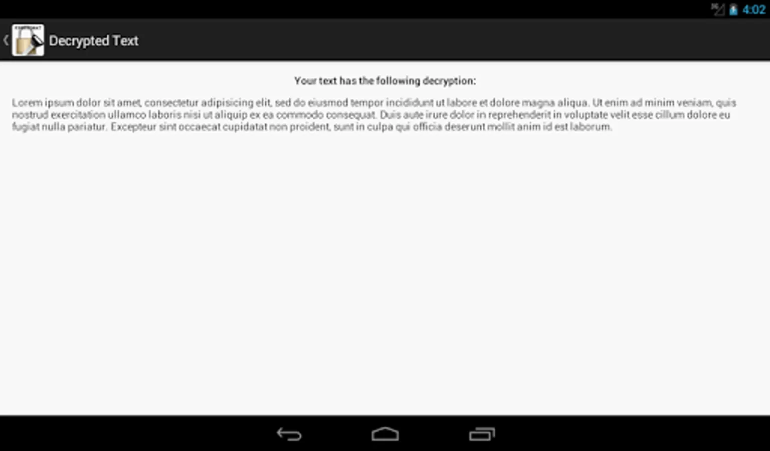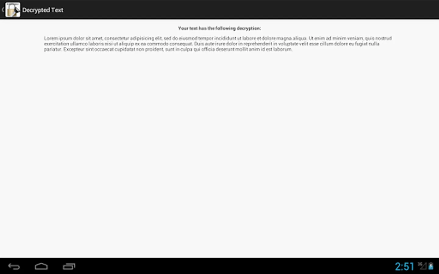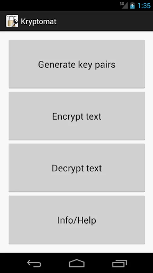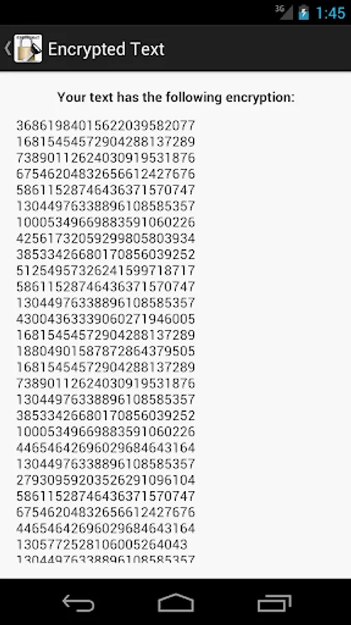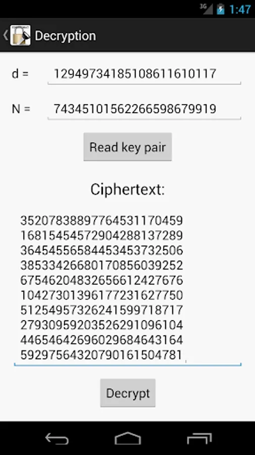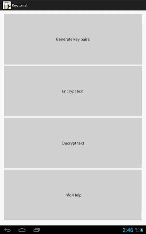 With Kryptomat texts of any length can be encrypted using the RSA method. The strength of the encryption can here be specified during encryption using the bitlength (military standard are 1024 bits) of the primes to be generated. The bitlength is, however, dependent on the available heap memory in Android. Due to this restriction key pairs could be produced with a maximum bitlength of 1023 with the devices tested so far.