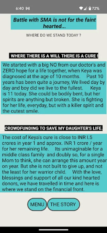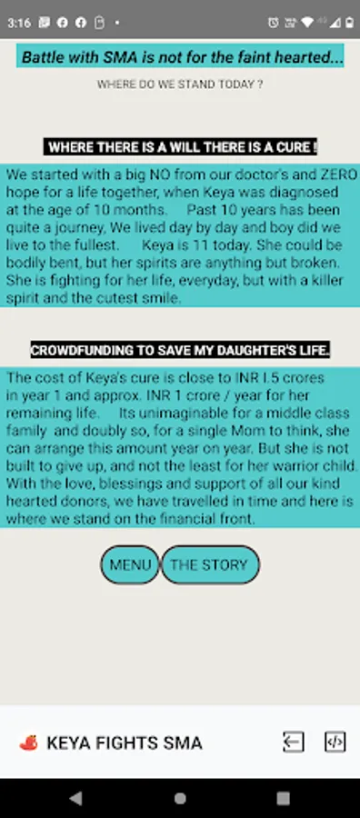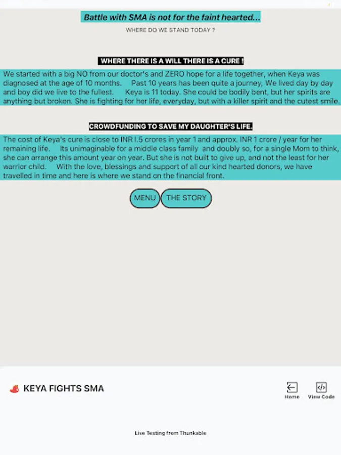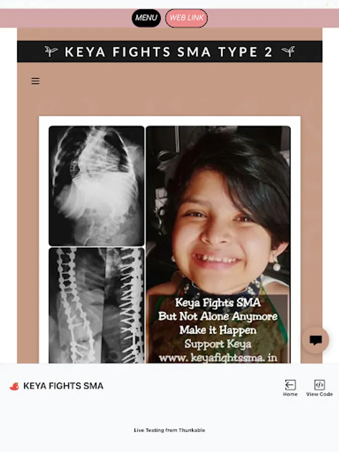 Keya, an 11 year old girl born with the genetic disorder called as Spinal Muscular Atrophy, has coded her own app to share with the world how her journey has been, how she has fought it against all odds along with her mother. We hope that the app spreads the awareness about Spinal Muscular Atrophy. This app also aims to help her collect funds for her treatment and update everyone about her progress.