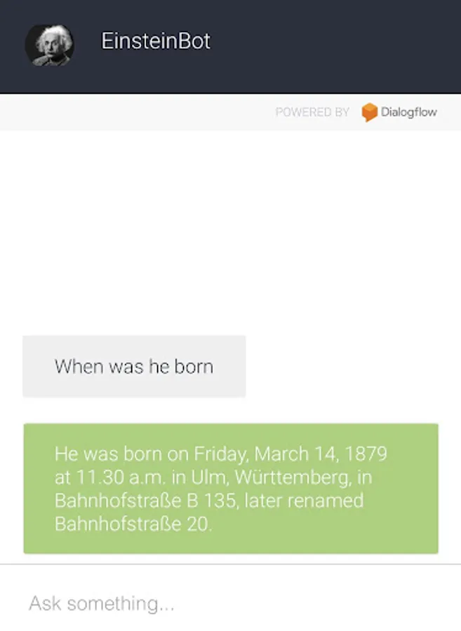 Learn about Albert Einstein and his life in this app through a Bot using ML enabled Question - Answers.