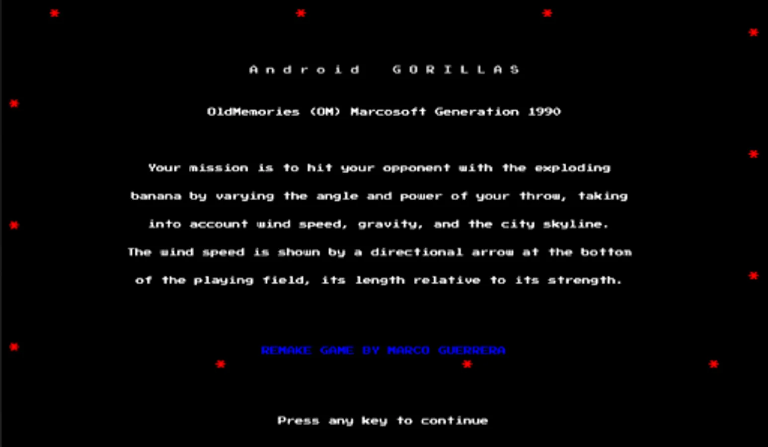 Two gorillas, positioned on opposite sides of the screen, will have to try to hit themselves by throwing bananas, defining the trajectory of the shot by entering parameters such as speed and angle, trying to consider the random arrangement of the skyscrapers between them, the direction and intensity of the wind.