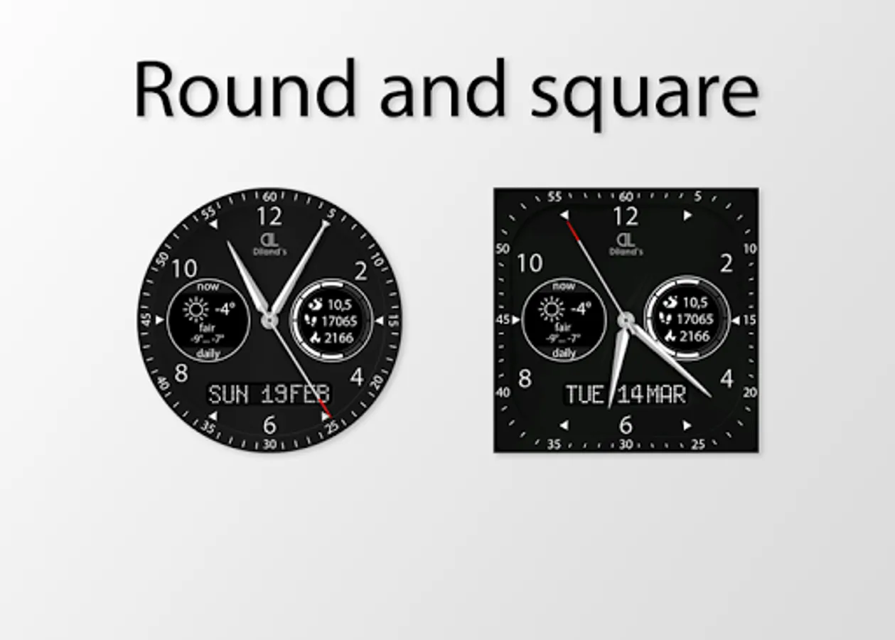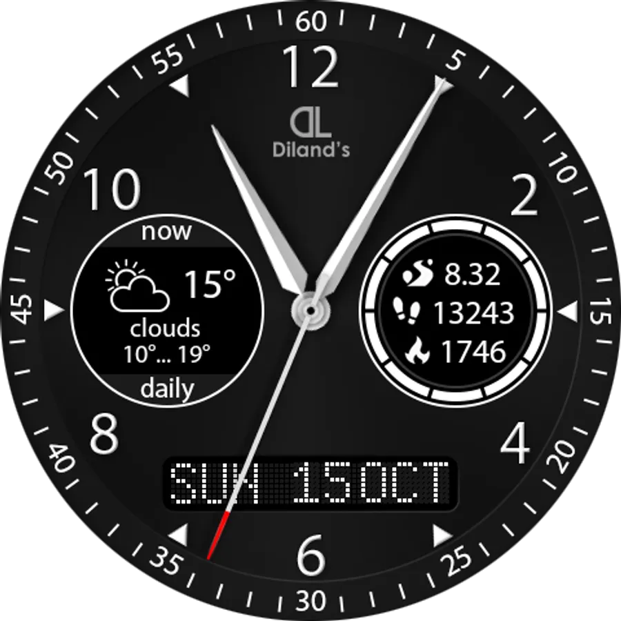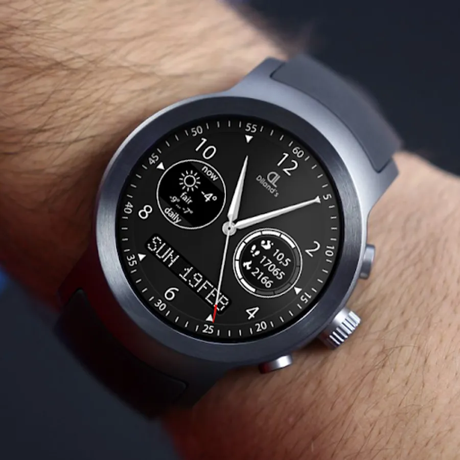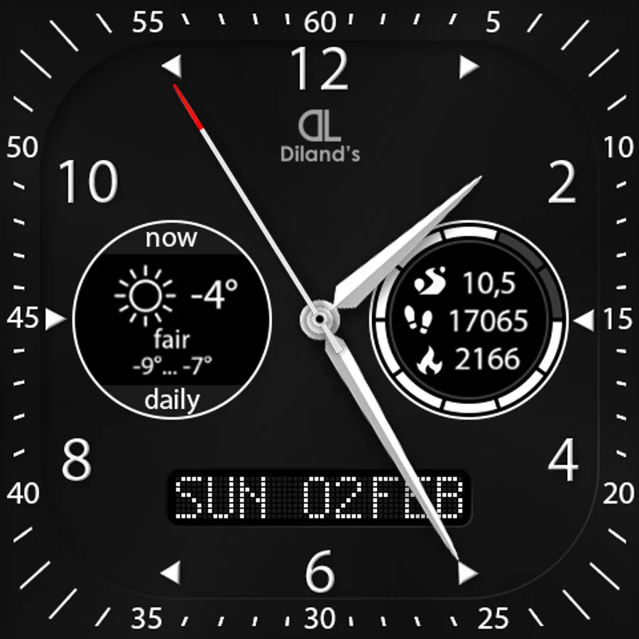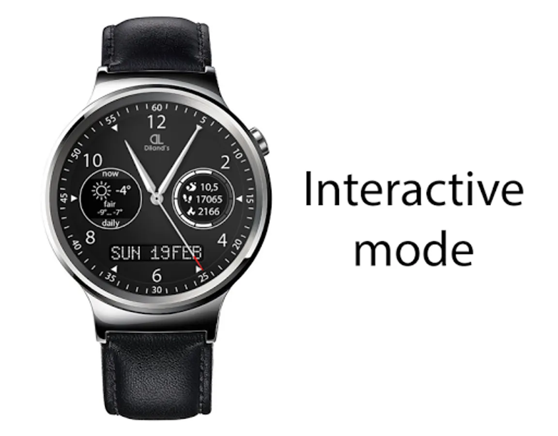 Diland's companion - it's a cool and elegant watch face for Android Wear device. The design of the dial combines a strict appearance and multifunctionality. The most useful information for active people is available just with a quick sight. The watch face displays a current weather information and a daily forecast. Also the dial allows to get the fitness information from Google Fit directly from the screen of the watch: distance, steps count and burnt calories. It makes the watch face suitable for doing sport. Also you will be aware of the watch's battery level.