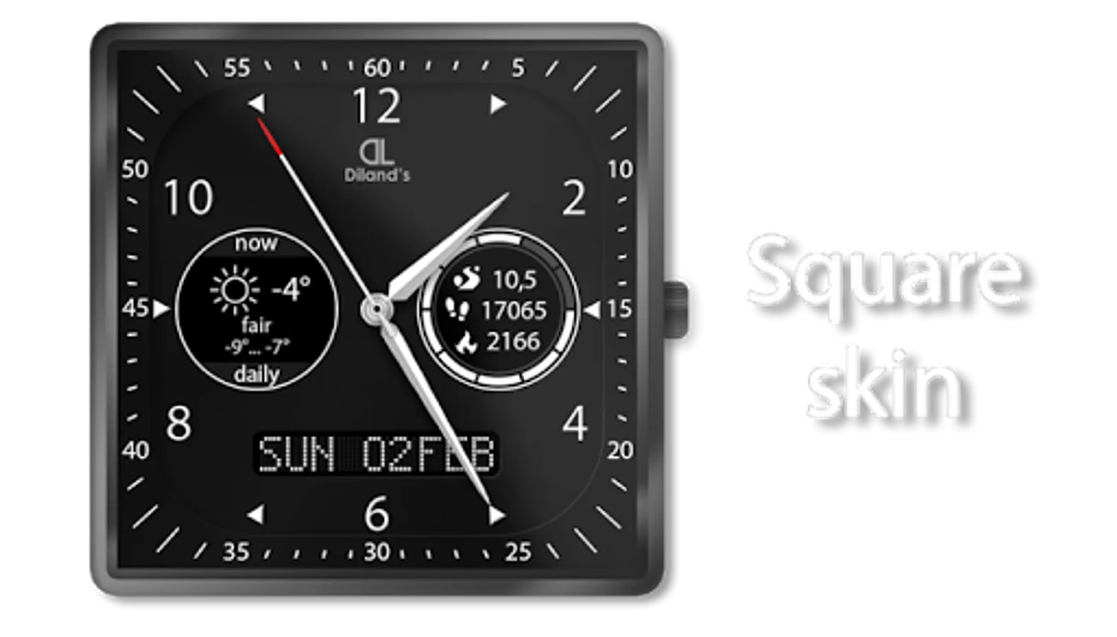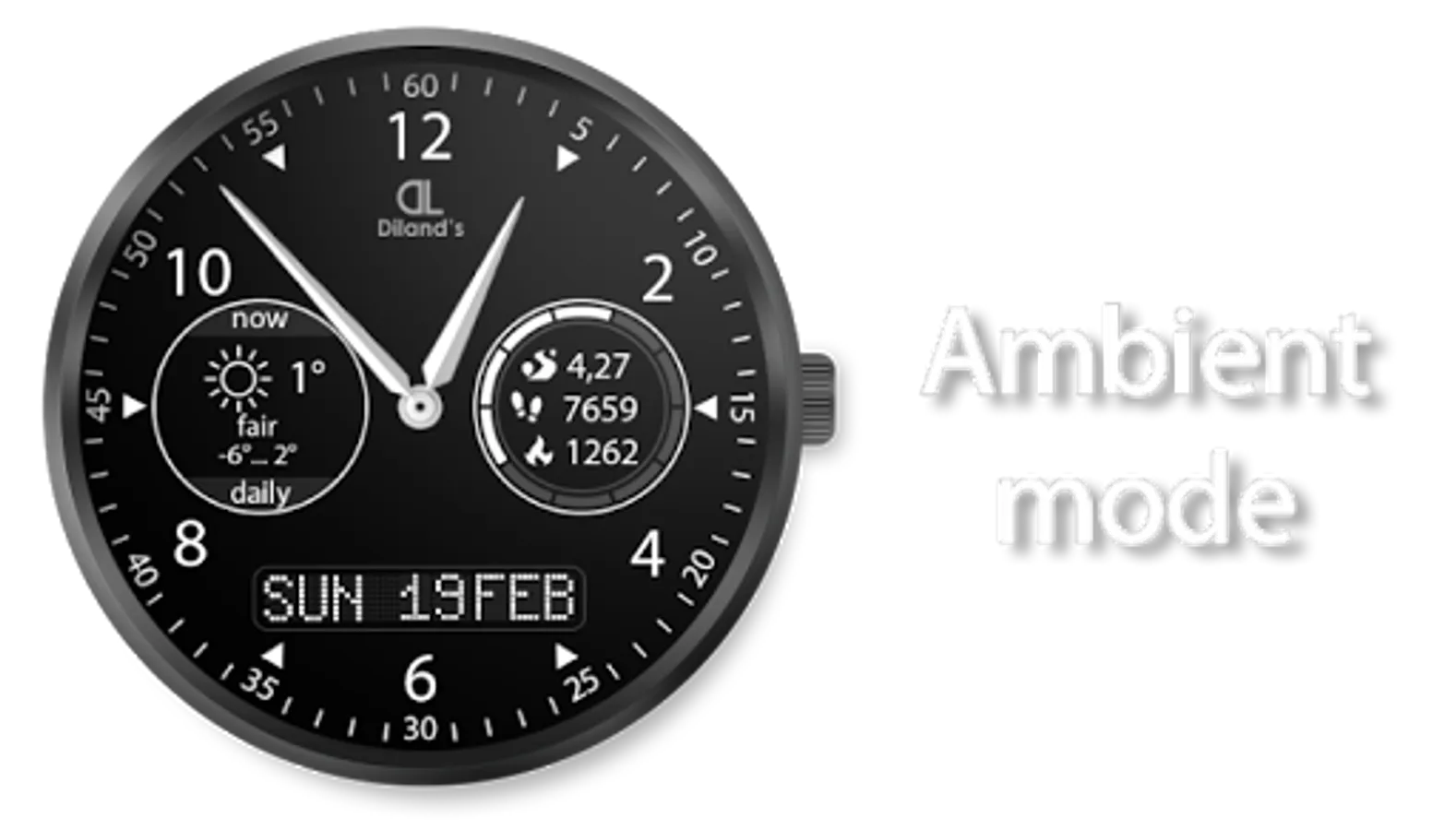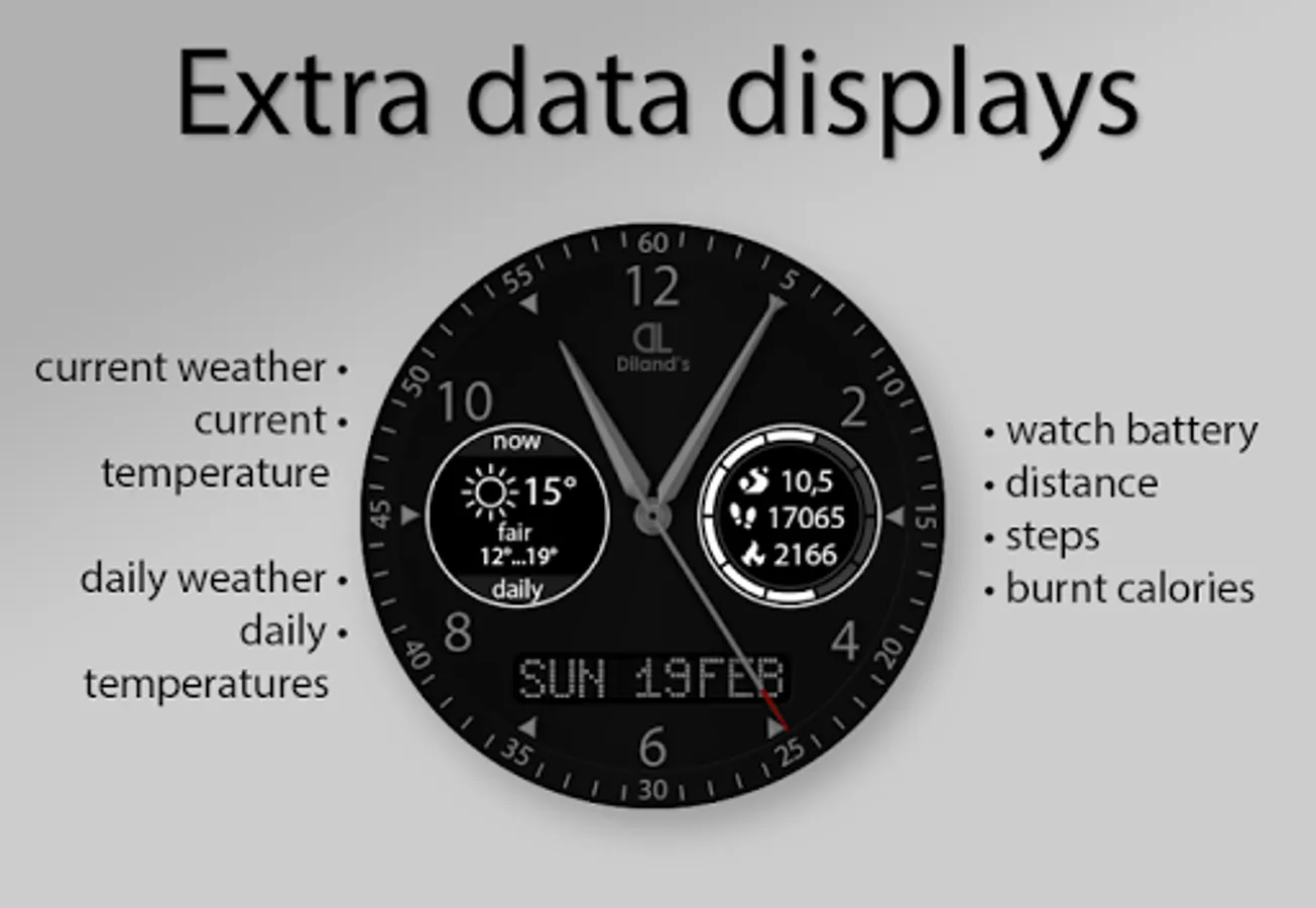 Diland's companion - it's a cool and elegant watch face for Android Wear device. The design of the dial combines a strict appearance and multifunctionality. The most useful information for active people is available just with a quick sight. The watch face displays a current weather information and a daily forecast. Also the dial allows to get the fitness information from Google Fit directly from the screen of the watch: distance, steps count and burnt calories. It makes the watch face suitable for doing sport. Also you will be aware of the watch's battery level.