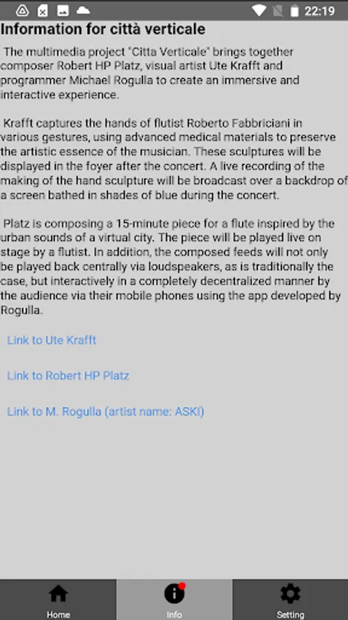 Participate in the next performance of the composition "città verticale" by Robert HP Platz by contributing sounds via this app.