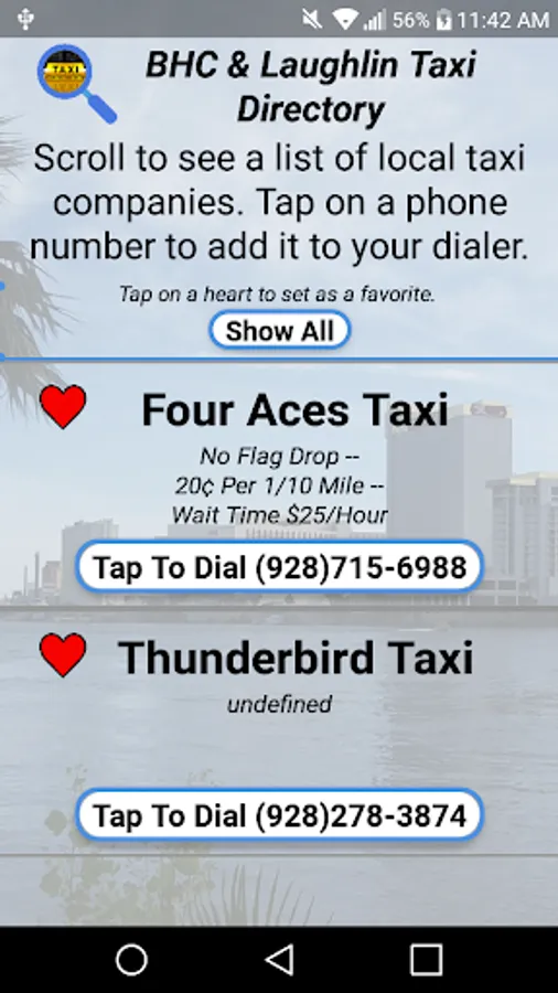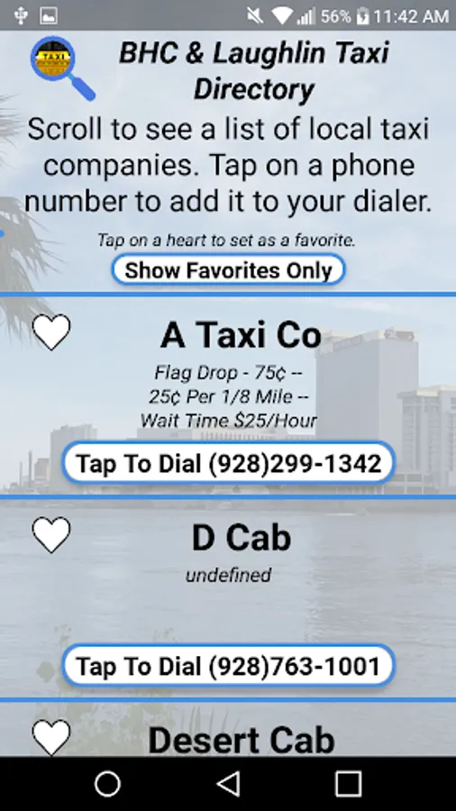 Taxi Directory for companies listed in Bullhead CIty Arizona and Laughlin Nevada. Each listing has rates reported by submissions and updated regularly. Each company is listed with it's phone number which can be added to the phone's dialer with a tap.