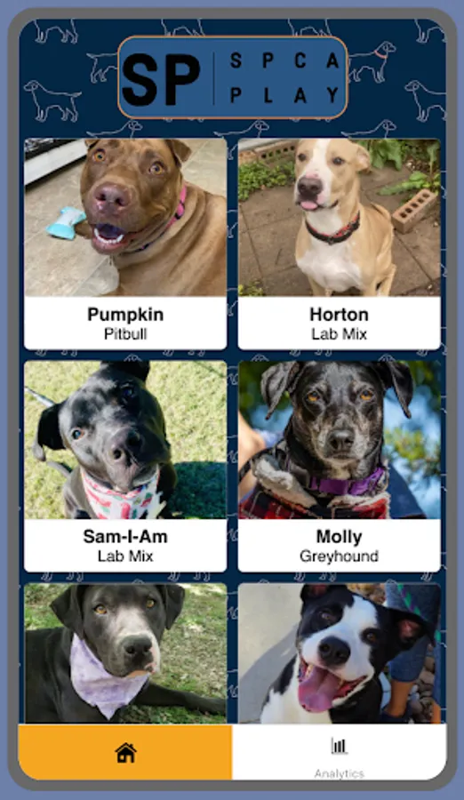 Welcome to SPCA Play! This application is used to keep track of the dog's daily activities. At the bottom of the screen, there are two tabs: Left Tab is the home screen and the Right Tab is to view the completed daily activities for each dog.