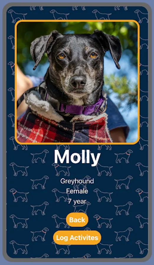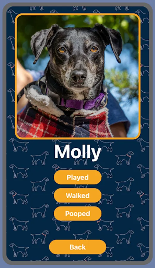 To Log Activities: Click on the Dog you would like to log activities for. You will then be brought to a screen with details about the dog. Then press the “Log Activities Button” and a screen will appear with available activities: “Play”, “Walk”, and “Poop”. Then press the activities that were performed.