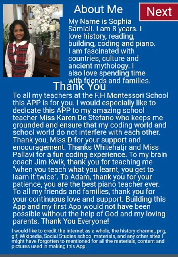 My Name is Sophia Samlall. I am 8 years. I love history, reading, building, coding and piano. I am fascinated with countries, culture and ancient mythology. I also love spending time with friends and families.