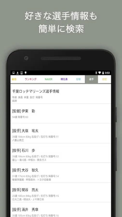 -「選手」ではロッテ所属の選手の詳細情報が知れます。