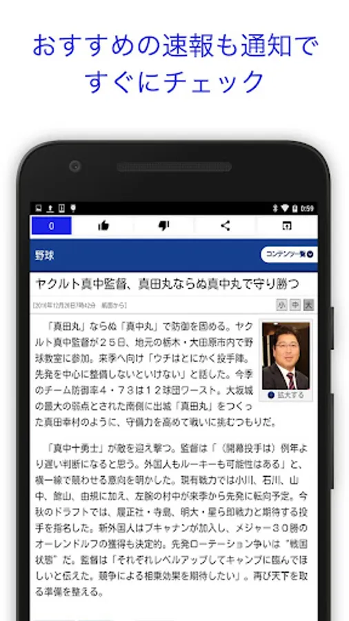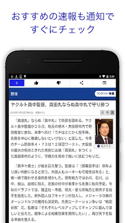 試合時間30分前の通知や、朝昼夜にわけた注目のプロ野球ニュース通知を受けることもできます。