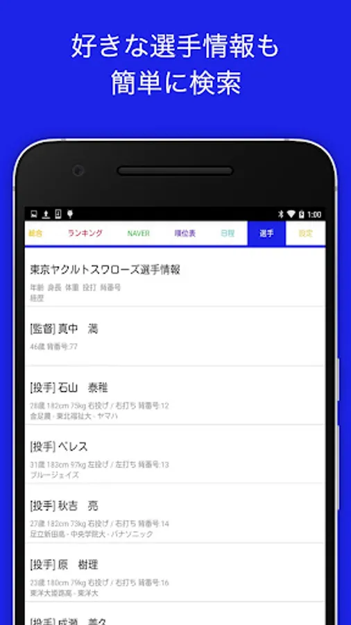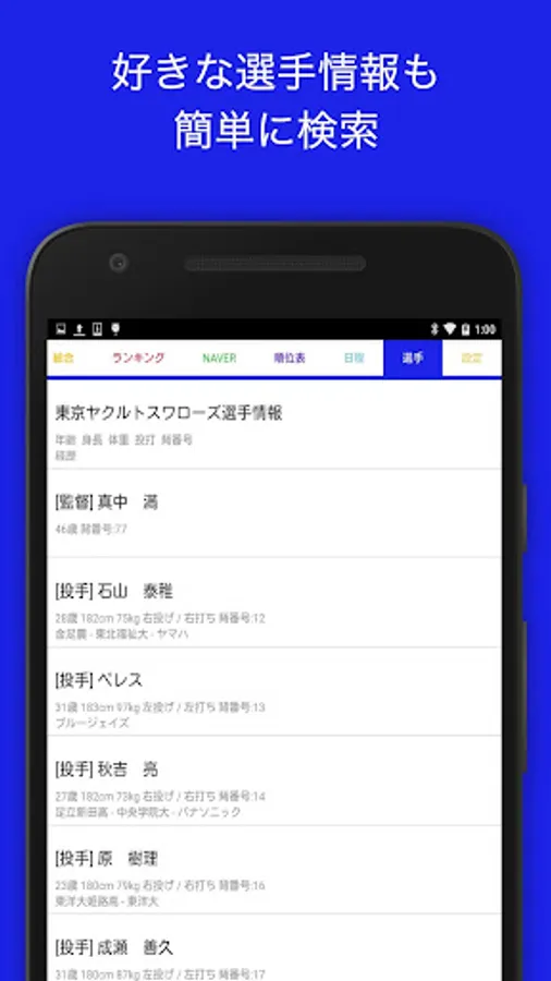 - 「選手」ではヤクルトの所属選手の詳しい情報が得られます。