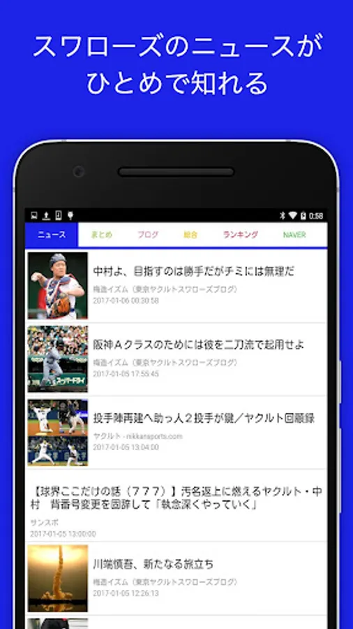- 「ニュース」ではスワローズのニュースが日付順に知れます。