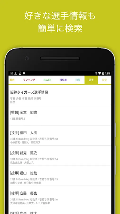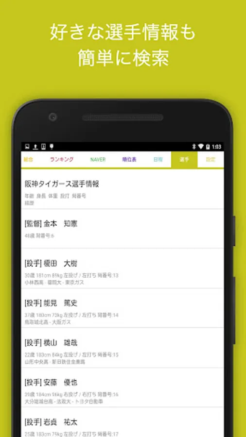 -「選手」では球団所属選手の個人成績等の詳しい情報がしれます。