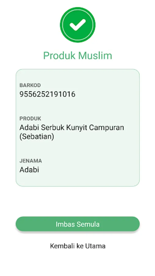 Aplikasi akan menyatakan hasil imbasan sebagai produk Muslim atau tiada dalam rekod.