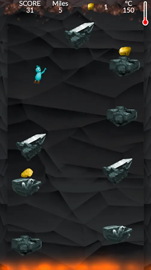 This game is a fast-paced 2D platform settled in a simplified design of a long tunnel which runs from the surface towards the center of the Earth. The main character, whose original name you learn in the game, will descend across the strata composing the whole planet during the five levels, trying to reach his final goal. He will face dangers, hindrances and the upgrowing heating, helped only by his jumping abilities and the bonus items displaced over the platform rocks. Let's face the journey!