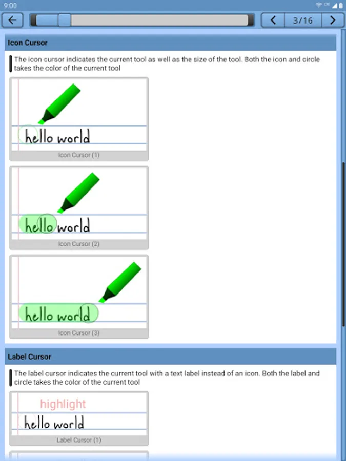 (3) Render an optional cursor on screen that indicates to the user at all times the selected writing tool or tool color.