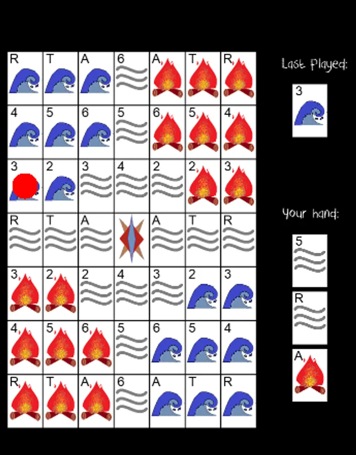 It is a card game with turn-based board. The objective is to align 4 tiles of the same color on the board. In each turn the player can choose the box that corresponds to one of the cards he has in his hand. In the case of the J, its use depends on the suit of the card, in the case of the J of "Air", the player can choose any free box to place a card of its color, in the case of the J of " Fire ", the player can choose a locker with a tile of a color of the opponent and remove that tile, and finally, the J of" Water "allows the player to choose a tile where there is a chip of the opponent's color and turn it into the own color.