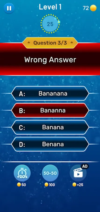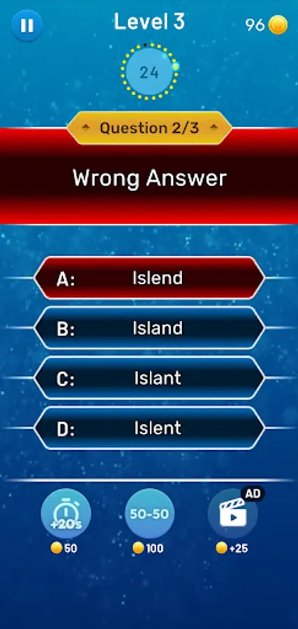 Timer is given for each question. You can remove two of the four options when you are confused. You get coins for each correct answer. Which can be used to increase the time or remove the option. There is lots of fun playing this game.