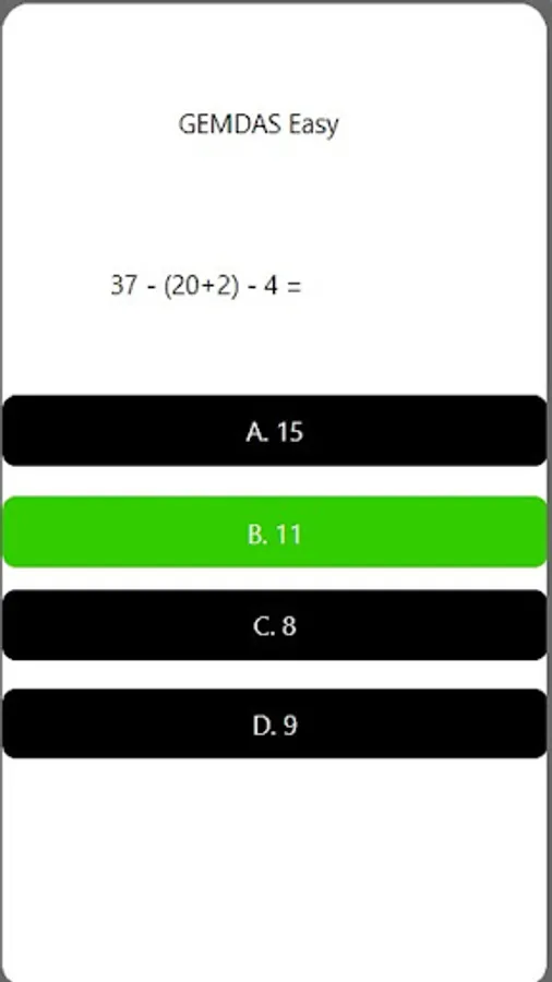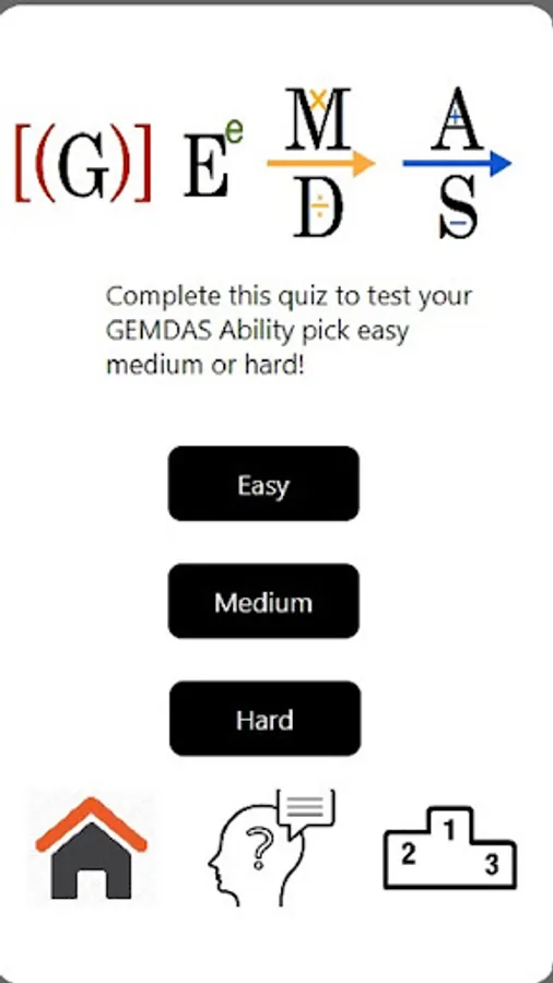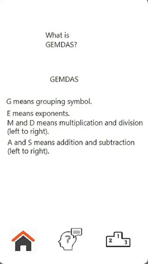This app will cover the concept of GEMDAS/PEMDAS (Parentheses, Equations, Multiplication, Division, Addition, and Subtraction.) You can pick the difficulty of the questions. Solving the questions of this app will help you to improve your problem solving skills.