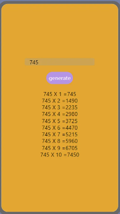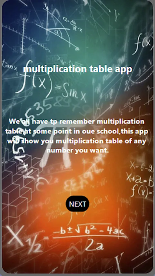 This app is to produce multiplication of any number you want positive negative or fractional numbers. We all have to remember multiplication table at some point in our school, this app will show you multiplication table of any number you want.