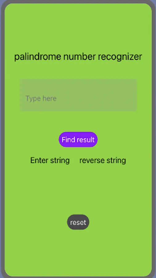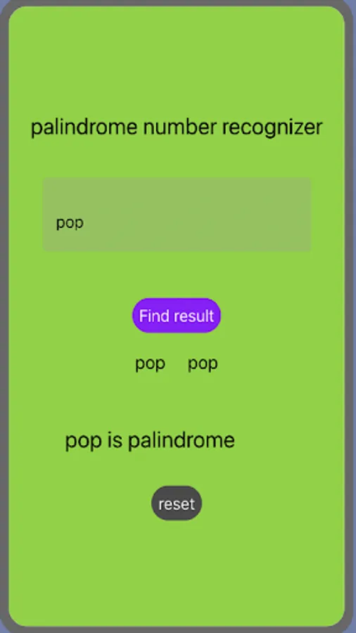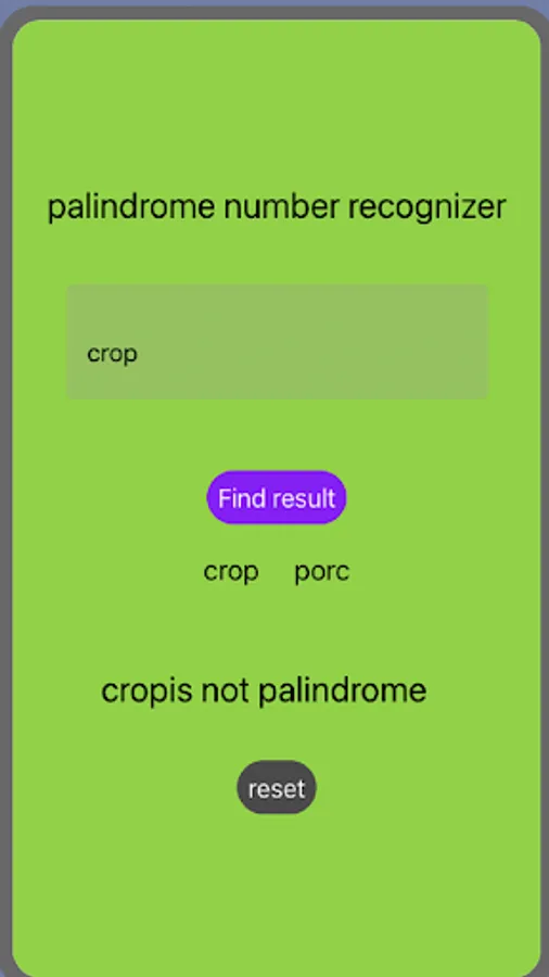 "TO KNOW THE PALINDROME. IT HELPS YOU TO KNOW IF STH IS A PALINDROME OR NOT. • THIS APP IS JUST FOR FUN."