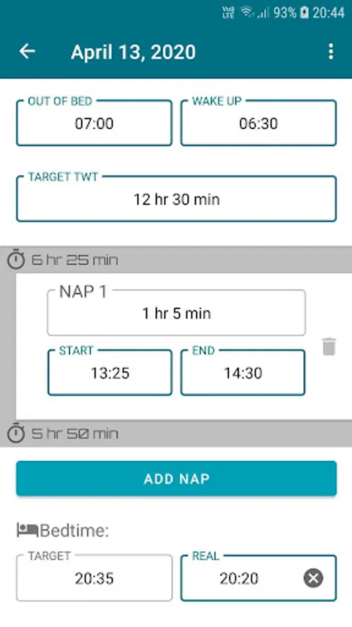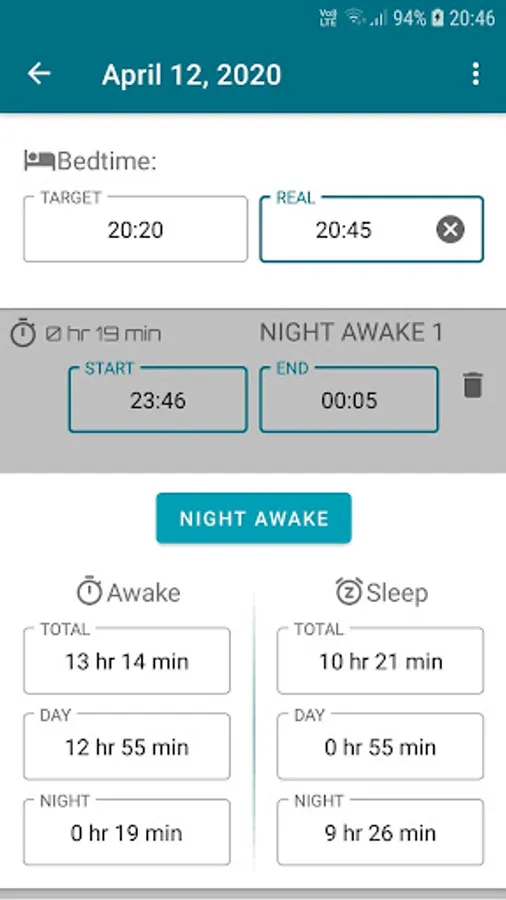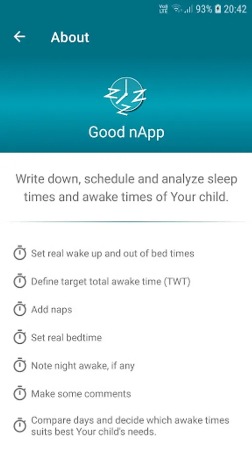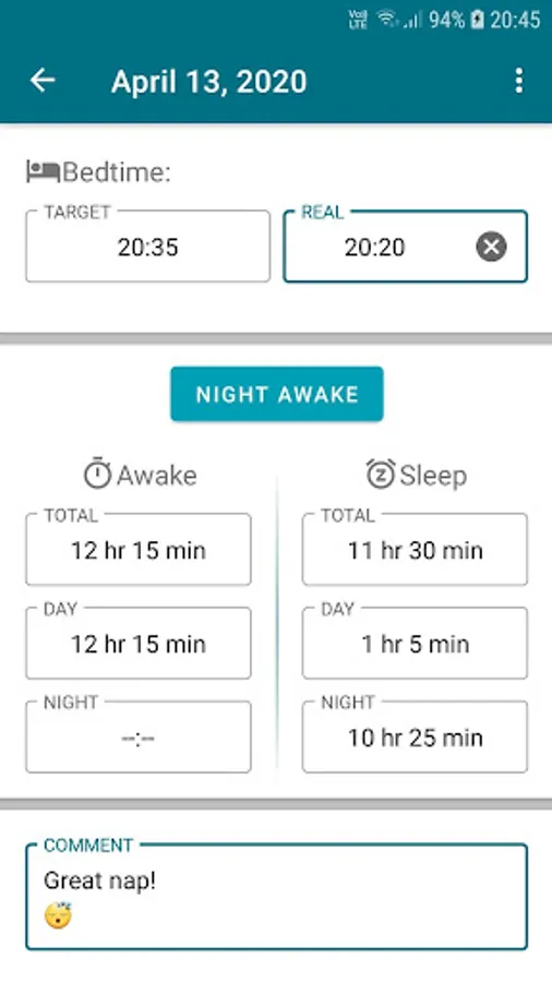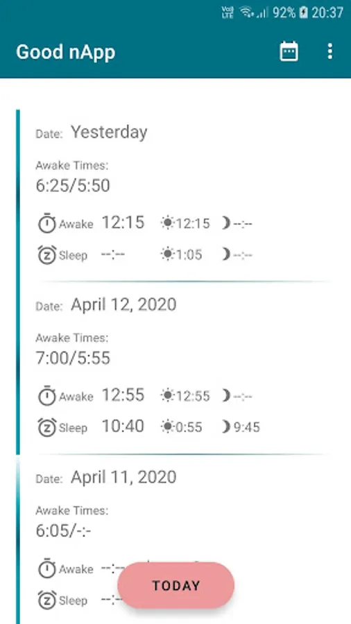Good nApp allows to write down awake times and sleep times to help parents observe and determine the appropriate sleep requirements between subsequent sleep phases. It calculates total awake time and total sleep time.