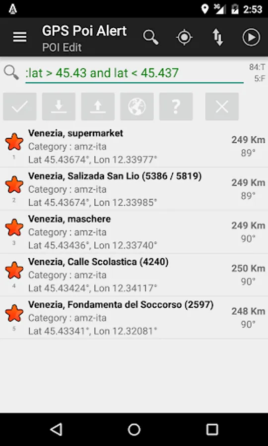 • dist(gps) < 1000 selects all POIs in 1 Km radius from GPS fix