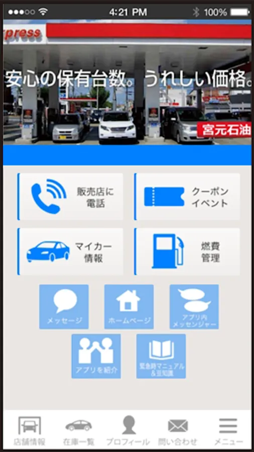 Our shop is engaged in gas station business, rent-a-car business, used car sales business as "(Miyamoto Petroleum Island bridge bridge service station)"!