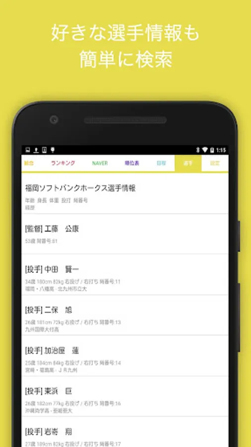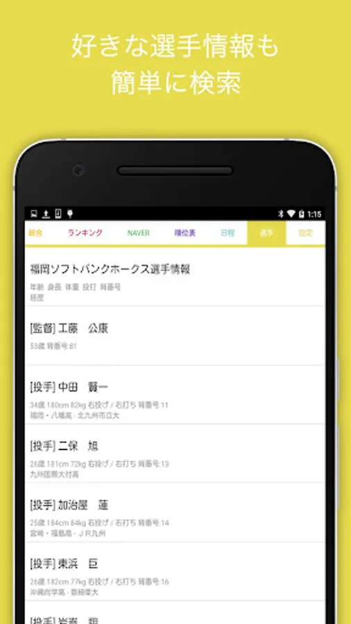 - 「選手」では所属選手の詳細情報を知ることができます。