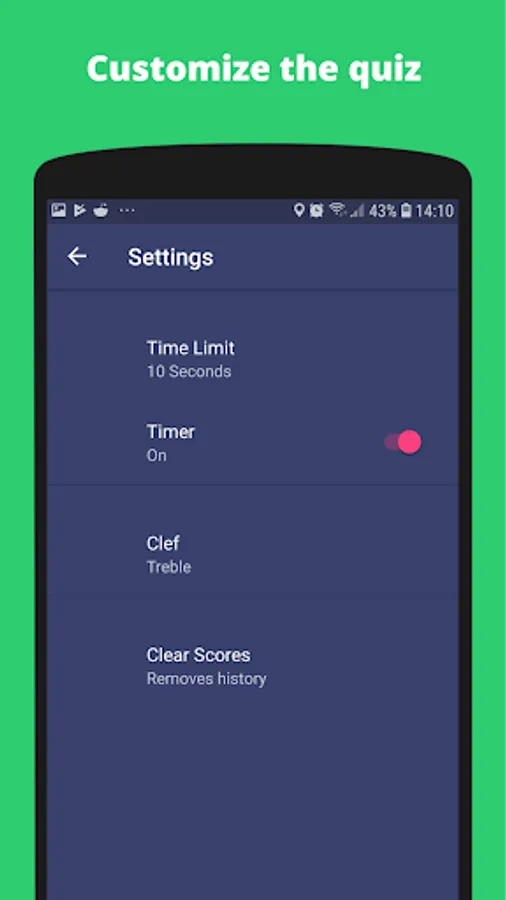 To help train, you can choose from a variety of different quizzes. For each quiz you are given a limited amount of time to guess each key signature. If you wish you can focus on just major/minor signatures or on sharps/flats.