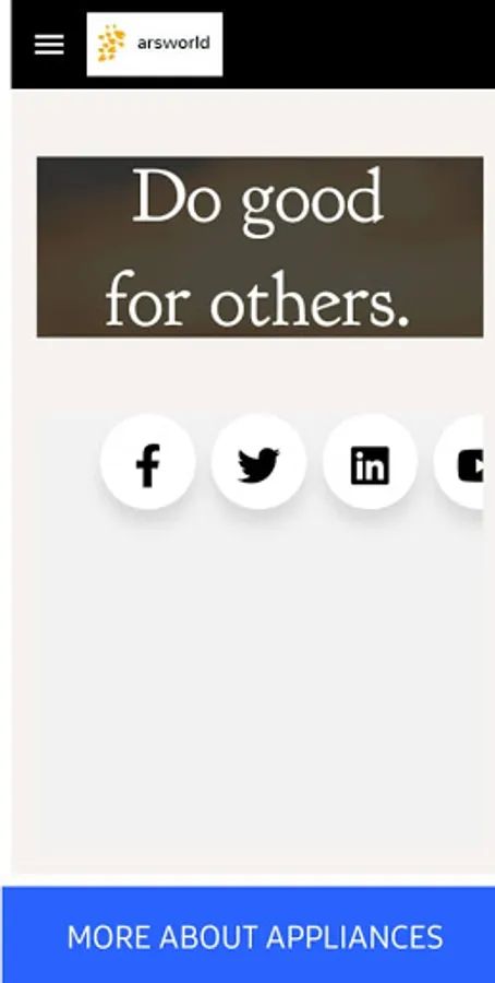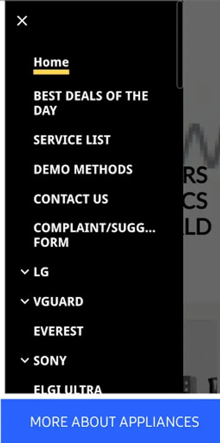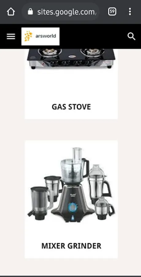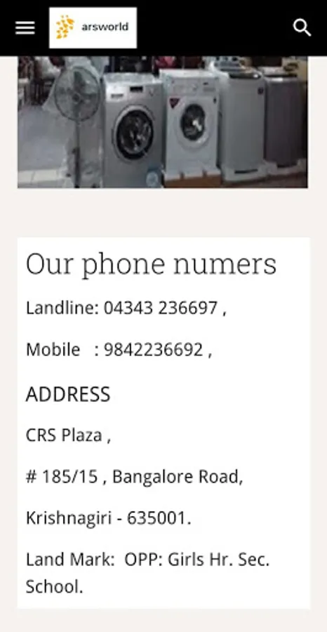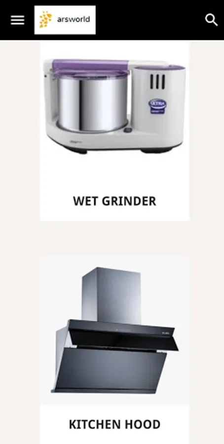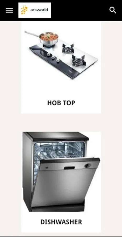 At opening page you get home page of ars world at top-left three lines will be present when you click it you will get brand wise details,demo methods,service list,contact us. In home page of ars world at bottom more appliances button is there click it, you get category wise products . Best deals of the day is updated daily check it out. Complaint/suggestion form is present your valuable suggestions will be recorded and responded . At footer section of home page you will get ars world social media websites check it out!.YOUR VALUABLE TIME IS IMPORTANT FOR US.