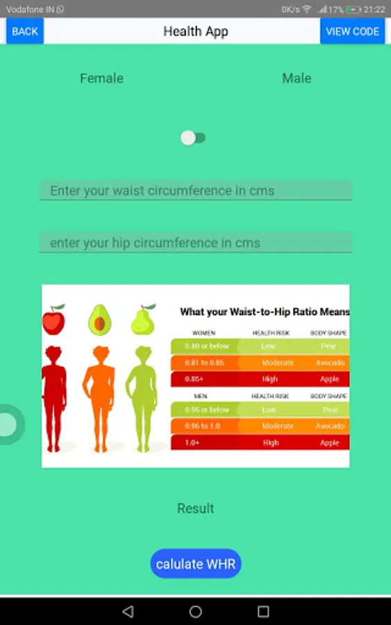 calculator requires you to type in height and weight and it would calculate your BMI.Heart Rate Calculator requires you to count and type in your pulse rate to see your heart rate.WHR also known as waist to hip ratio lets you know whether you are at a risk of coming in contact of a disease or not.