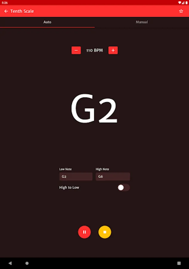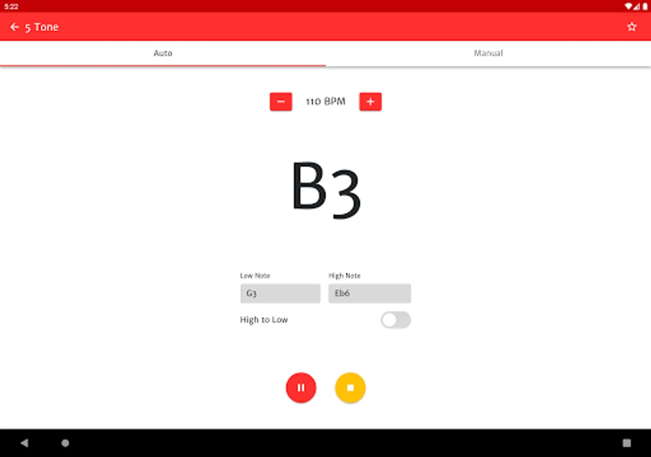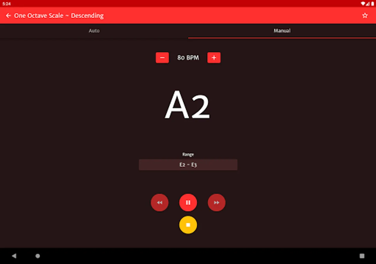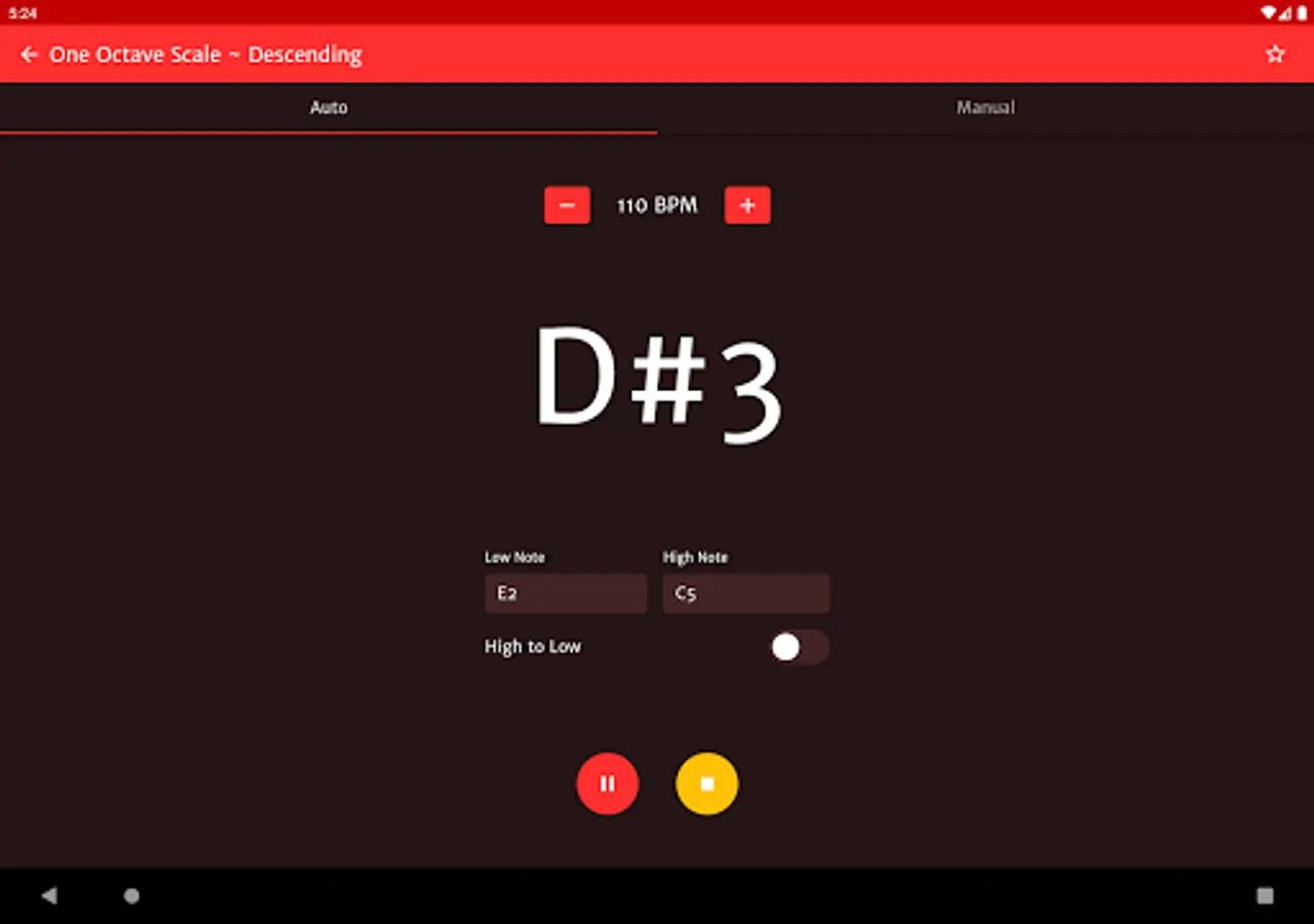 - In Manual mode the pattern/scale of the exercise advances higher or lower on demand. This is similar to practicing with an instrument.