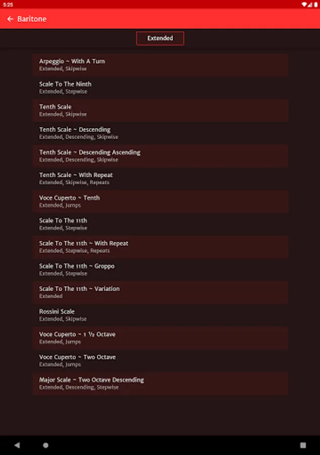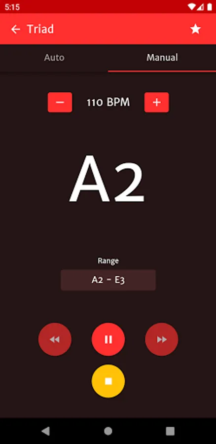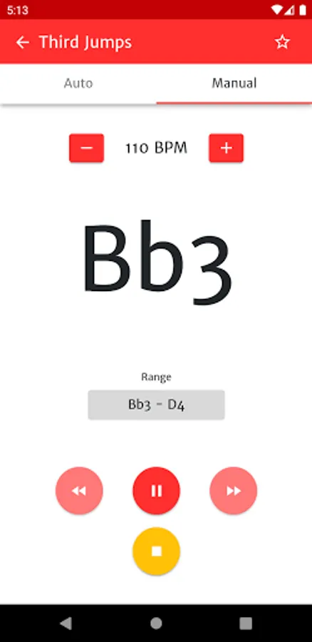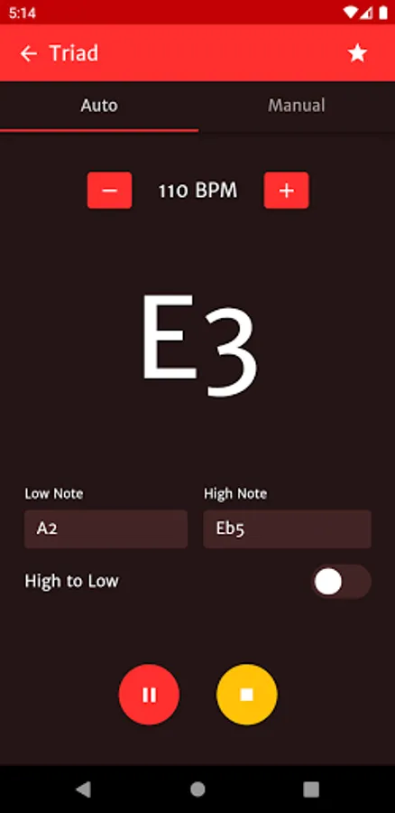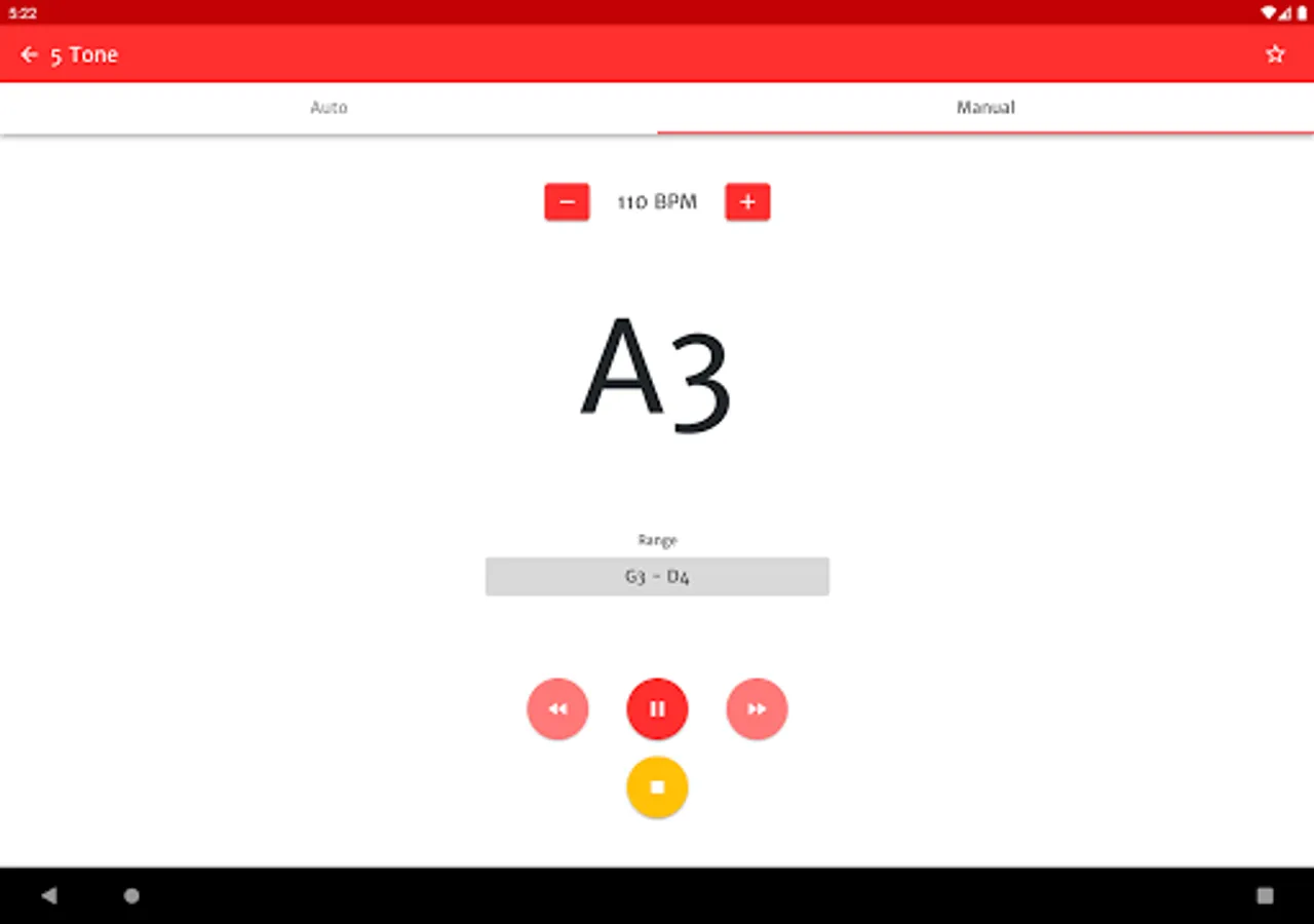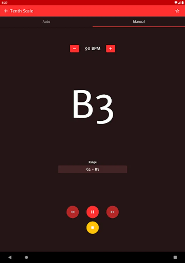 - In Manual mode the pattern/scale of the exercise advances higher or lower on demand. This is similar to practicing with an instrument.