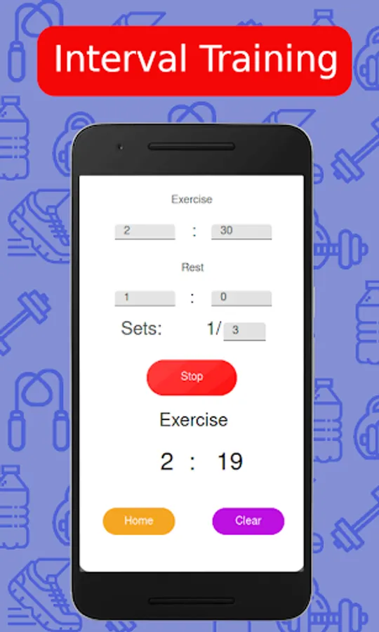 The Interval training mode allows you to set a timer with different exercise and rest durations. In this Pro version you can choose the amount of sets you want to do and keep track of them on the screen. The Interval training timer is suitable for: