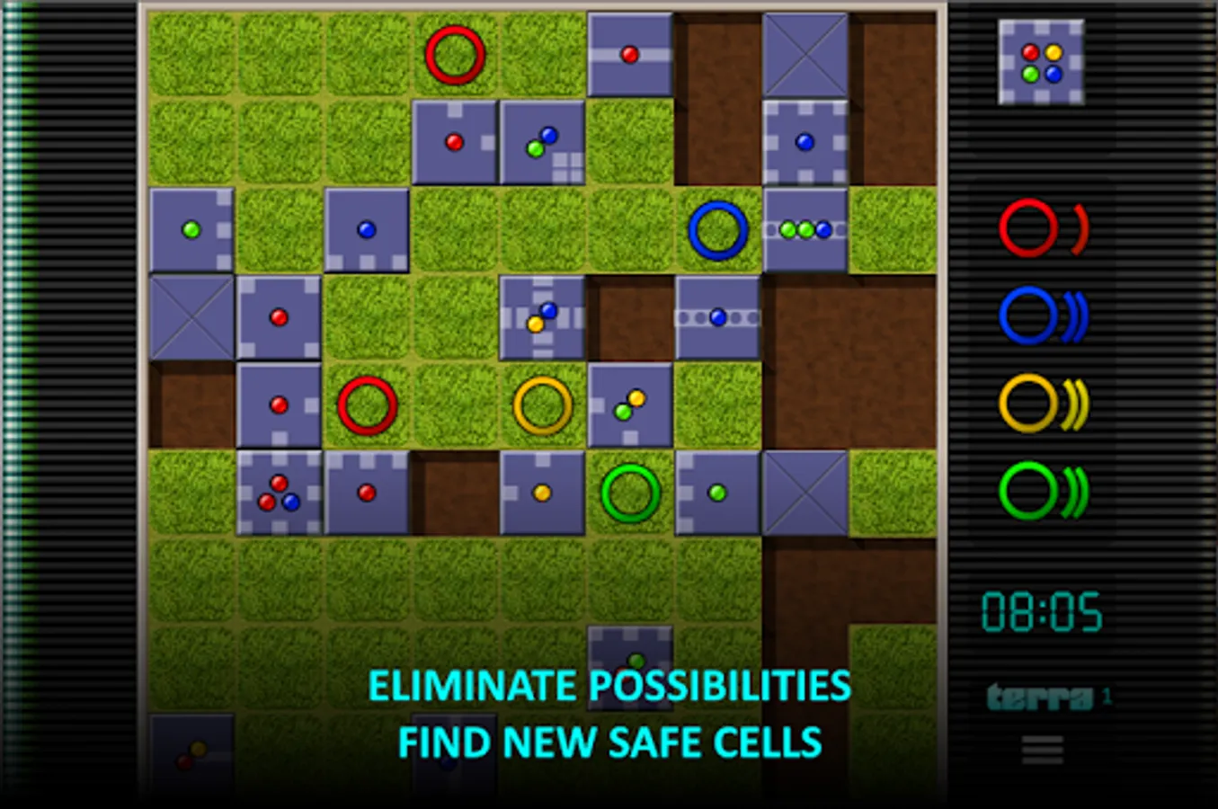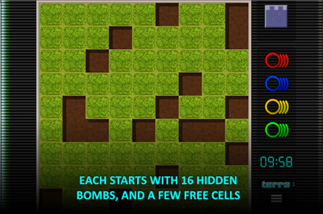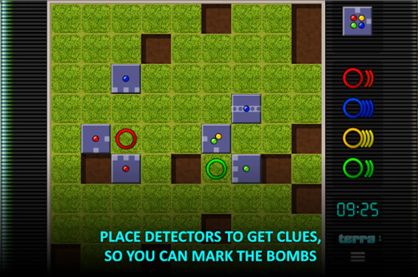 The game is played by placing detectors in excavated cells, which give you clues as to where the bombs are hidden.