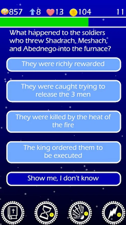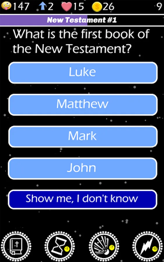 You can find your own answers in this Bible Trivia questions and answers game, too, or use the hourglass to extend the time to answer. You can also use the Bomb to clear 2 of the wrong answers, and you can use the Lightstrike when you must get it right!
