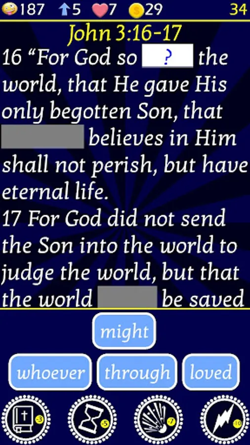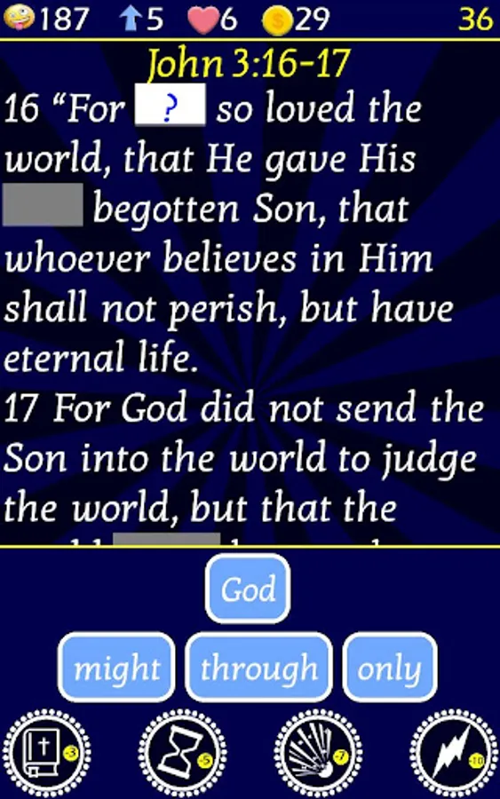 You can use the Bible to find your own answers, the Hourglass to extend the time to answer, the Bomb to clear half the answers and the Lightstrike to get it right when you give up!