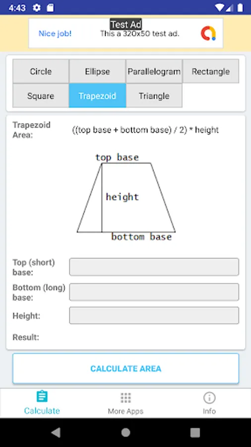 Area Calculator - Find the area of: Circle, Ellipse, Parallelogram, Rectangle, Square, Trapezoid and Triangle.
